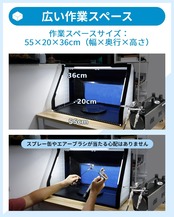 広い作業スペース: ペインティングブースの開口部が広く、吸引範囲が広い、塗装するときはスプレー缶やエアーブラシが当たる心配はありません、作業性がとても良いです。※作業スペースサイズ:55×20×36cm(幅×奥行×高さ) 。