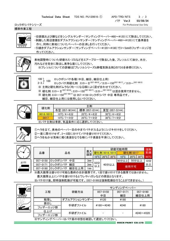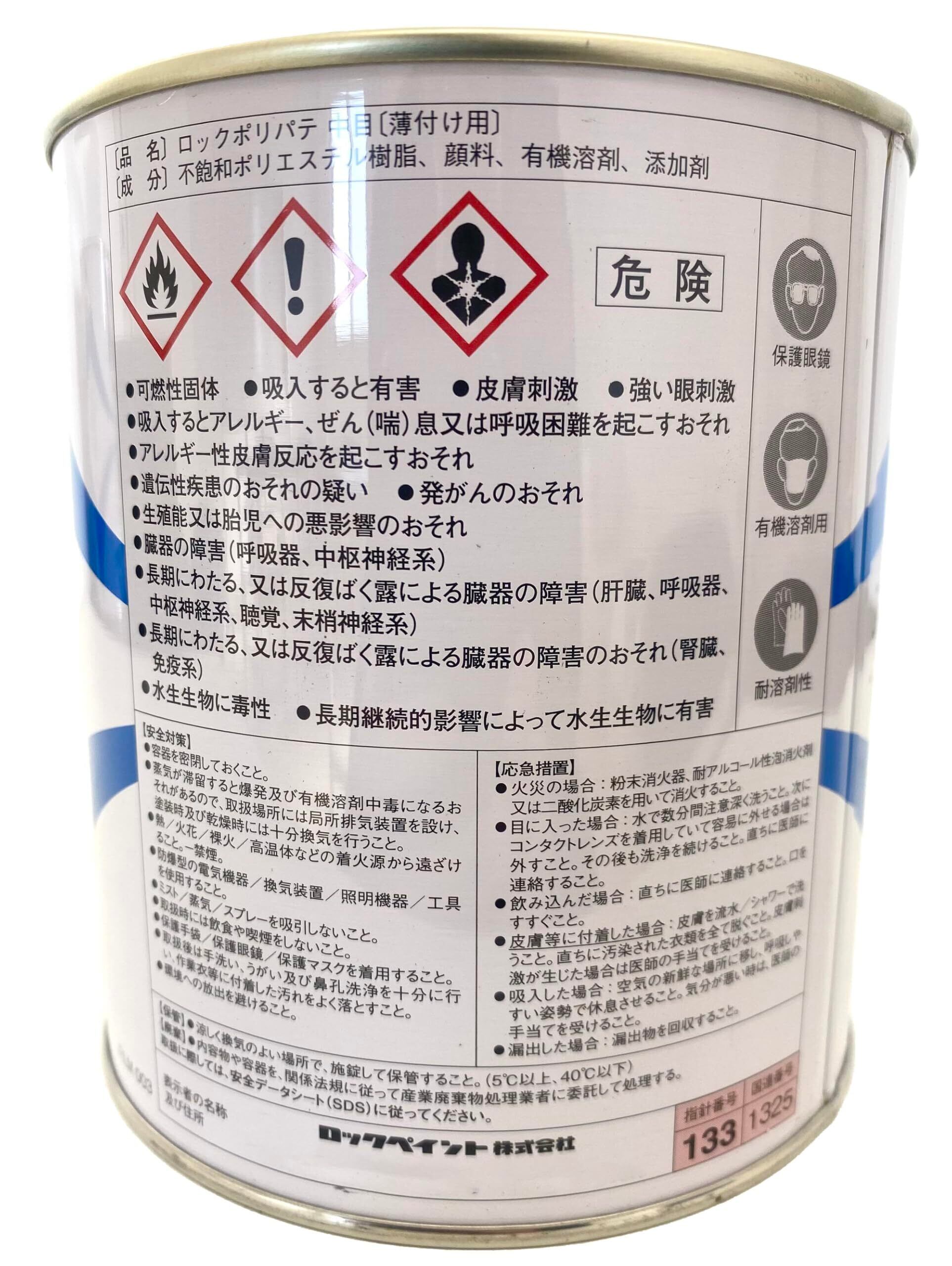 2液型のポリエステル樹脂のパテ 上塗りの吸い込みも少なく、また肉ヤセもあまりないので、広い用途に使用できる ポリパテとしては比較的厚付けができるタイプで、ヘラ付け作業性に優れており、思うようにパテ付けができて、素穴があきにくくなっている 表面乾燥性に優れ、ペーパーのからみや目詰まりが少なく、研磨性が良好 P180程度のサンドペーパーで研磨ができる 商品仕様 ・容量:パテ1kg&硬化剤20g ・適応素材:鉄鋼板 ・最大厚膜:3mm ・乾燥:即時強制乾燥可能 ・2液型 注意点 適切な保護具を着装してください。 使用時に専用硬化剤をご購入ください。 主剤と硬化剤をムラなく均一に混ぜ合わせてください。