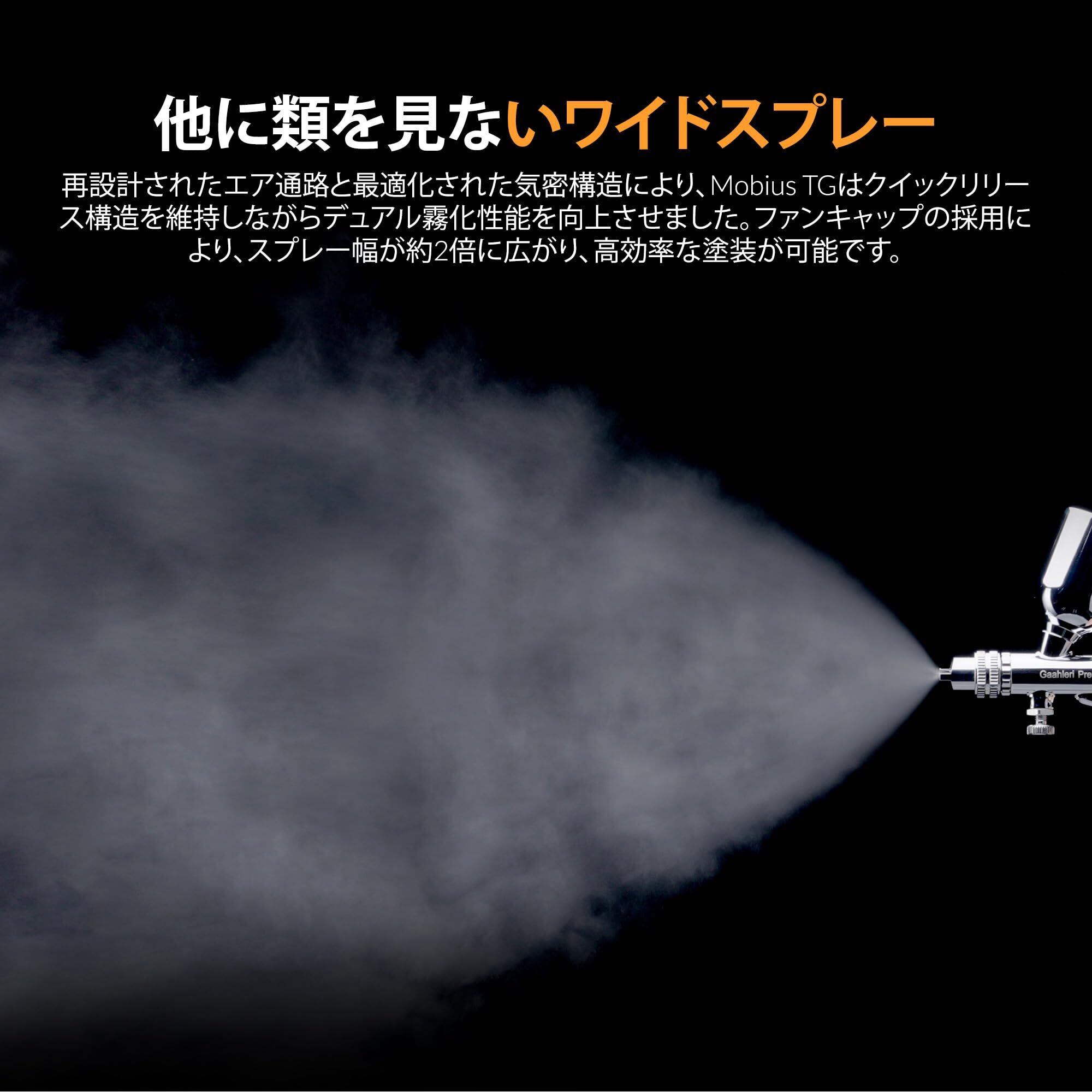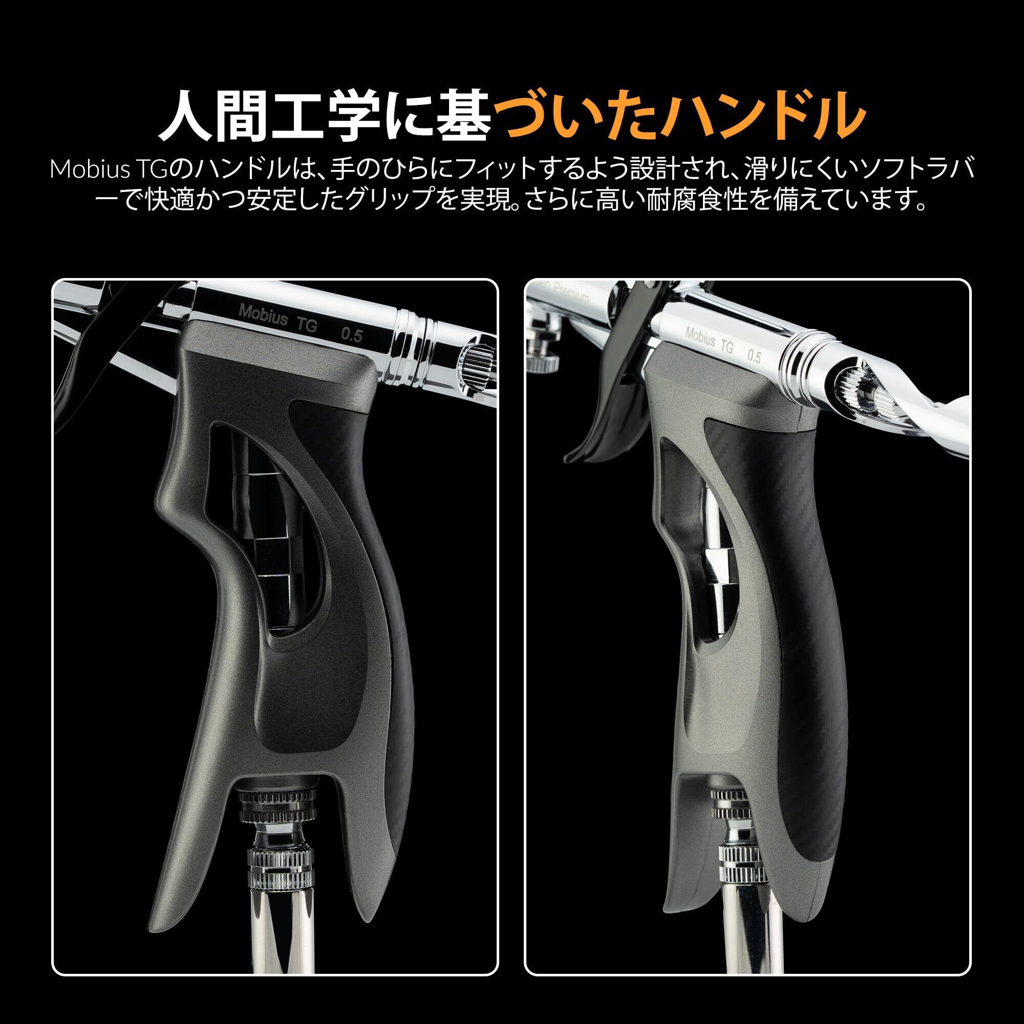 Mobius-TG Kenjiは、ダブルアクション機構を採用しており、塗料の吐出量と空気圧を自在にコントロールできます。0.5mmのノズル口径により、細部まで精密な塗装が可能です。多彩な技術を活かし、思い描くままの表現を実現します。