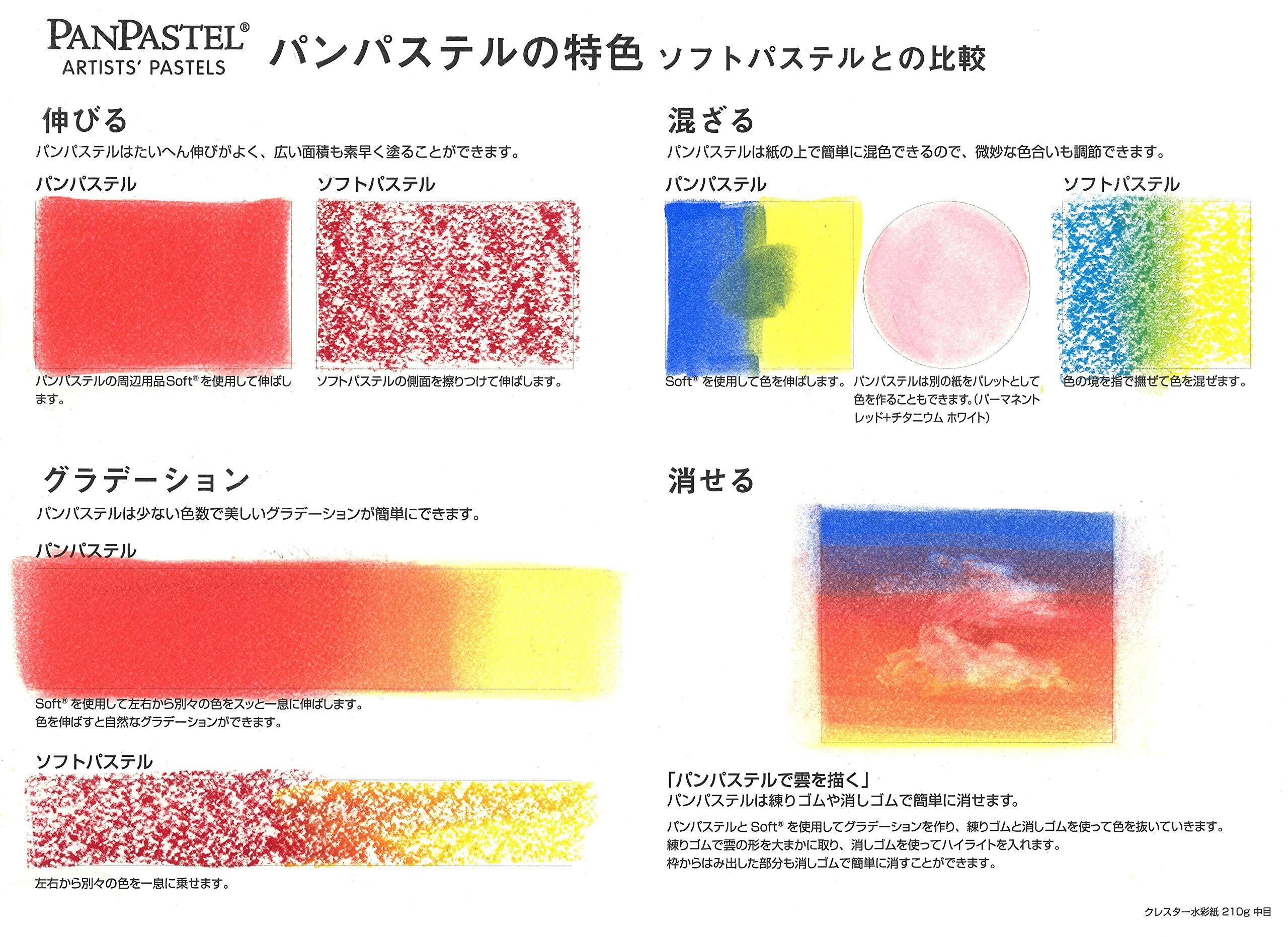 これまでのスティックパステルでは難しかった技法を簡単に表現する新時代パステルです。絵具のように色を取り、色をのせ、色を調整できるように考案されました。従来のパステルのような繊細な力加減は不要です。