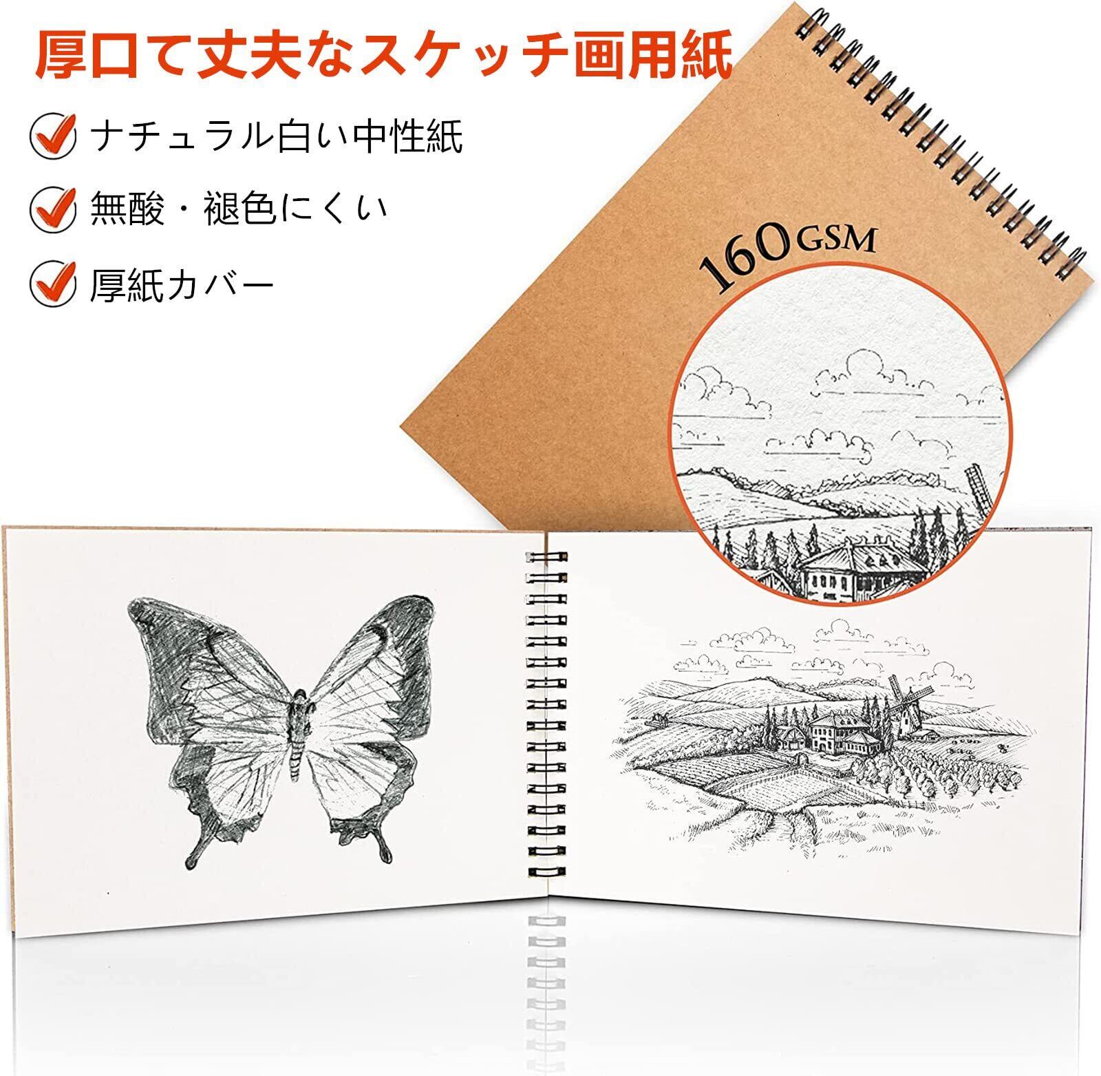 【厚口て丈夫なスケッチ画用紙】スケッチ紙厚み:160gsm 消しゴムで何回消しても毛羽立ちにくく、線をきれいに消し、複数の図面に耐えられます。また、紙質もしっかりしているのはもちろん、めくりやすいです。