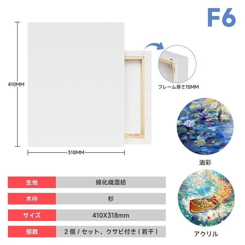 本商品は、410mm x 318mmのF6サイズを採用し、化繊綿で作られた厚手のキャンバスです。この優れた素材は、オイル漏れ防止機能を備えており、あなたの作品を長期間美しく保ちます。安心して様々なメディウムでお楽しみいただけます。