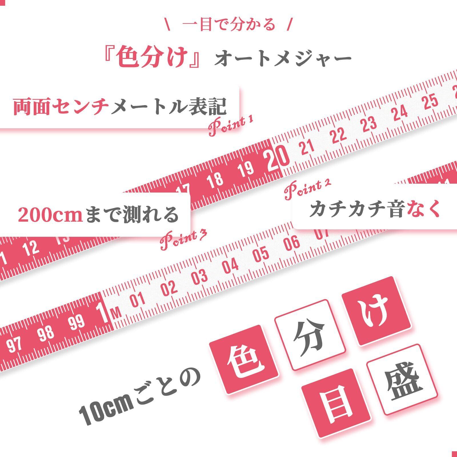 10cmごとに赤と白で色分けされたメジャーは、視覚的に非常にわかりやすく、長さの読み取りが簡単にできます。両面がセンチ表記なので、どちら側からでも寸法がすぐに確認でき、従来の片面がインチ表記のメジャーのように裏返す手間がかかりません。内部に無段階のロック機構が搭載されており、巻き尺を引き出す際にカチカチ音がなく、必要な長さでスムーズに止めることができます。従来品のように引き出したときに巻尺がちょっとだけ引き戻されてしまう悩みがありません。幅広のテープには鮮明に印刷された、見やすく正確な目盛りがあり、縦方向・横方向の目盛もついているので測るのに便利です。裁縫やウエスト、腹囲、段ボール、家具、ソーイングなどあらゆる場合に対応できます。ホワイト、ブラック、ピンクの3色から選べ、メジャーはPVC樹脂とグラスファイバー、ケースは高密度ABS樹脂で作られています。サイズはメジャーが長さ200cm・幅1.2cm、ケースは約H5.4×W5.4×D1.7cmになります。