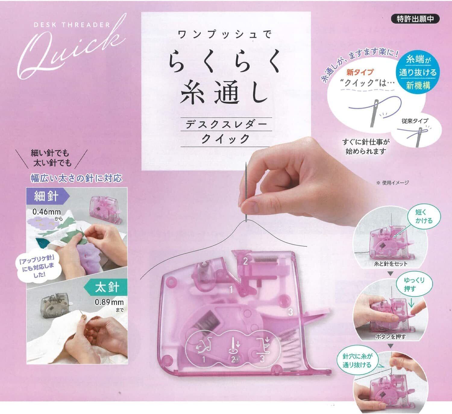 新タイプ「クイック」糸端が通り抜ける新機構で、ワンプッシュで楽々糸通しデスクスレダーは、細針~太針まで全ての穴位置を正確にとらえるよう設計されています。