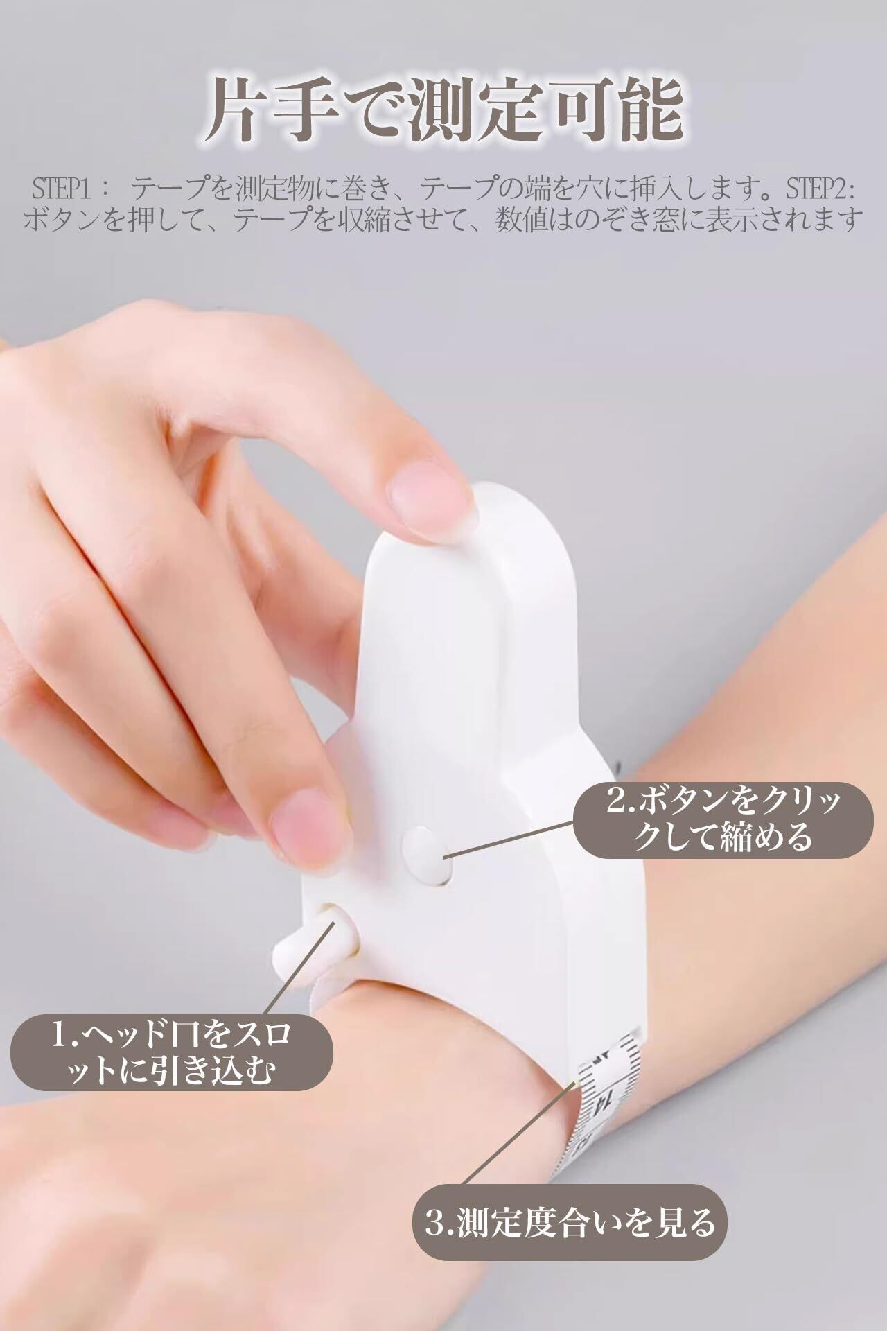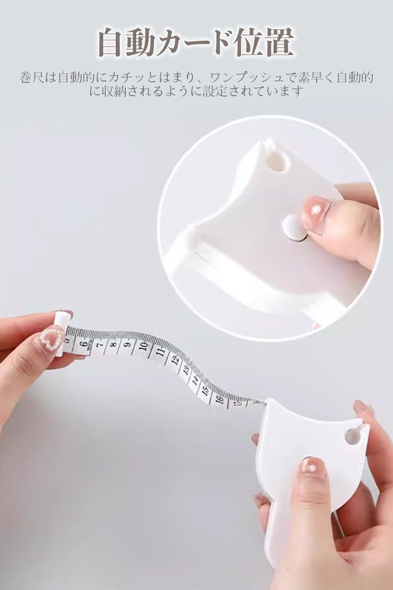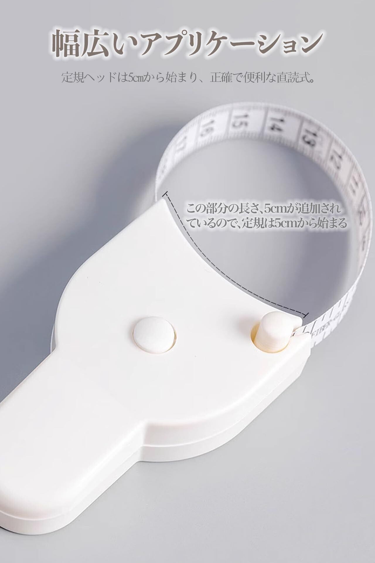 【 正確な測定システム】環状測定時に尺頭をカードスロットに挿入固定、 手持ち誤差を解消 、5cm起点目盛りで直接読取可能、 測定値計算不要のスマート設計。