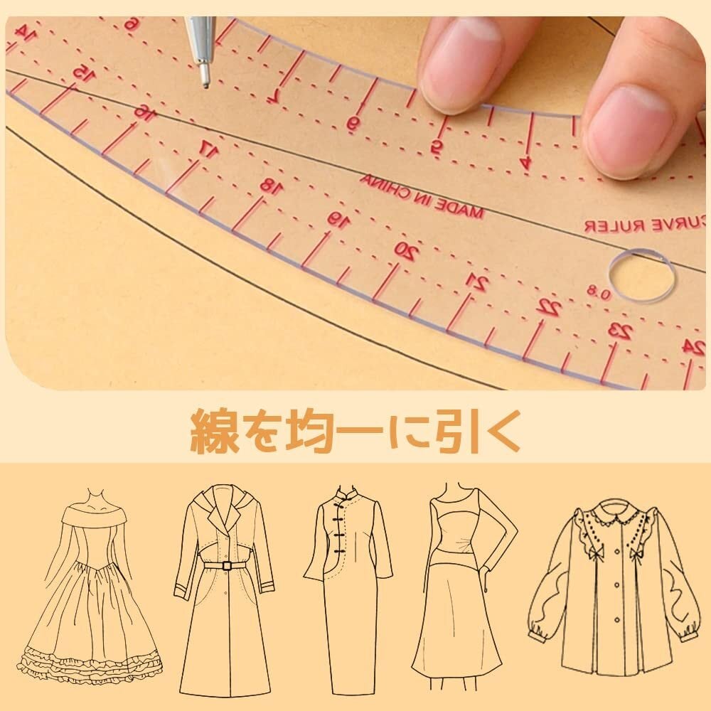 曲線や雲形、三角形など、さまざまなデザインを可能にする4枚のルーラーが揃っており、特に服作りやDIYの際に役立ちます。それぞれの定規は異なる形状を持っているため、あなたの創造力を自由に発揮できます。