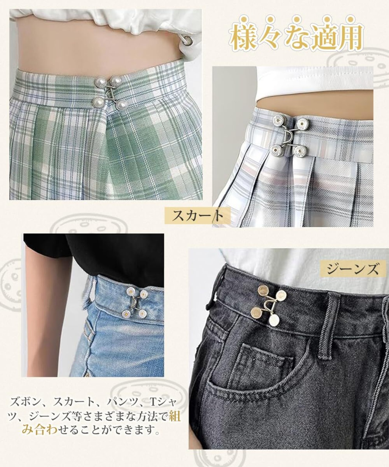 この調整ボタンは、ジーンズだけでなくズボンやスカート、さらにはTシャツ、パーカーなどにもご利用いただけます。わざわざ新しい服を購入する前に、簡単にお気に入りのアイテムを復活させることができます。