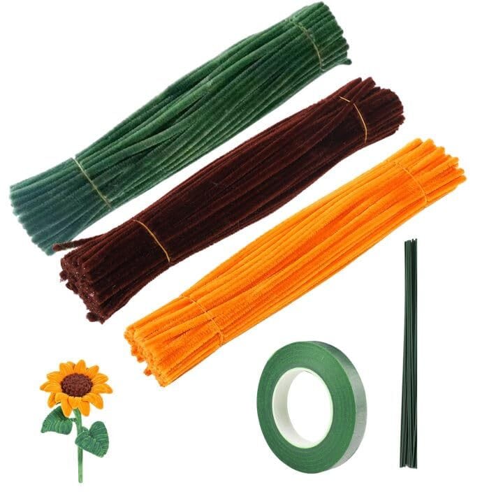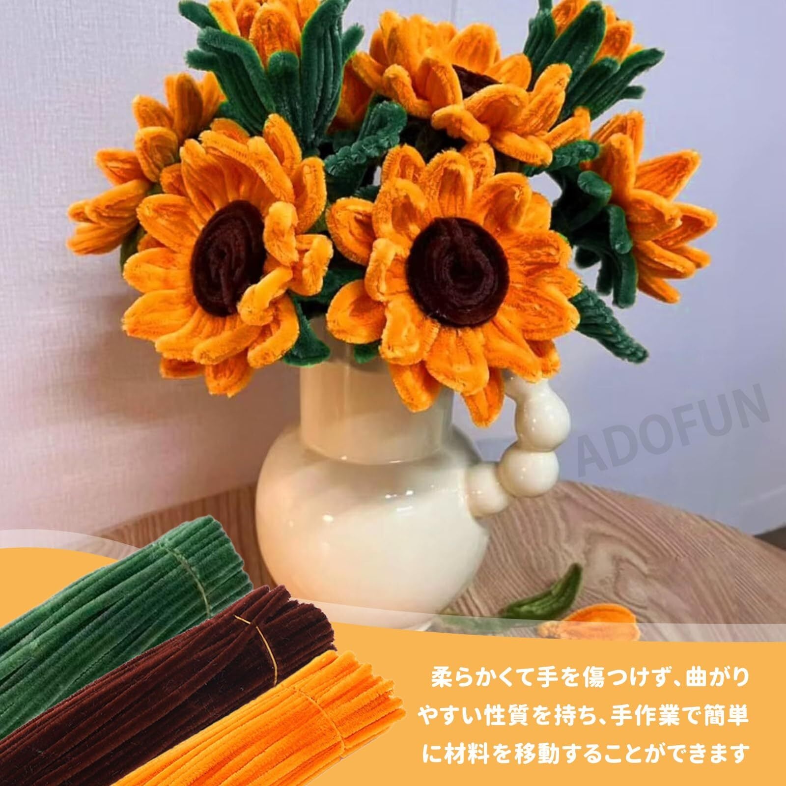 内容: 工作モール 手芸モール カラーモール ひまわりのブーケ工作キット 造花 曲げ可能 造形材料 造花の茎 園芸用粘着紙
