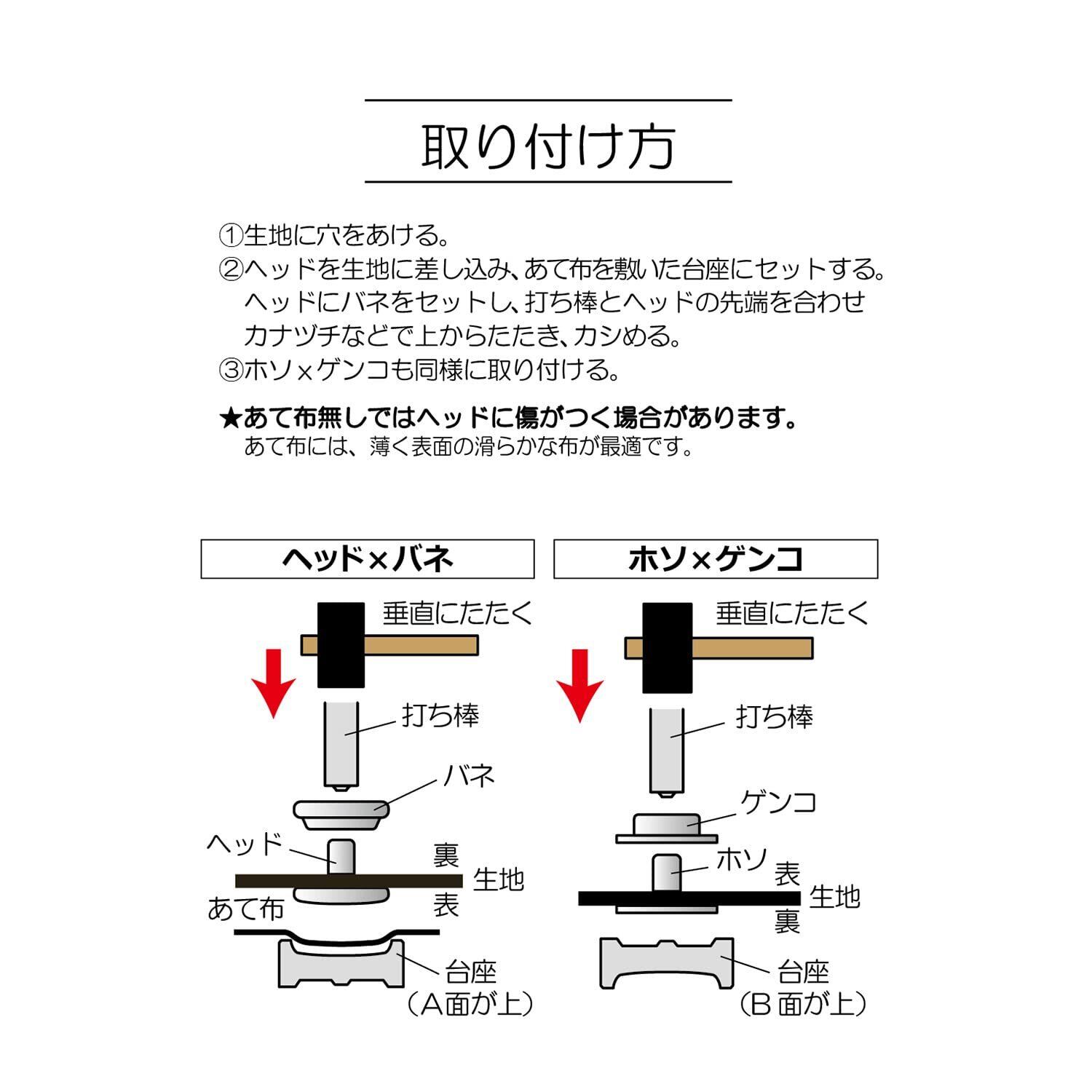打ち具が付属しているため、手軽に取り付けが可能です。特別な道具は必要なく、誰でも簡単にボタンを取り付けることができるため、手芸初心者の方にも最適です。
