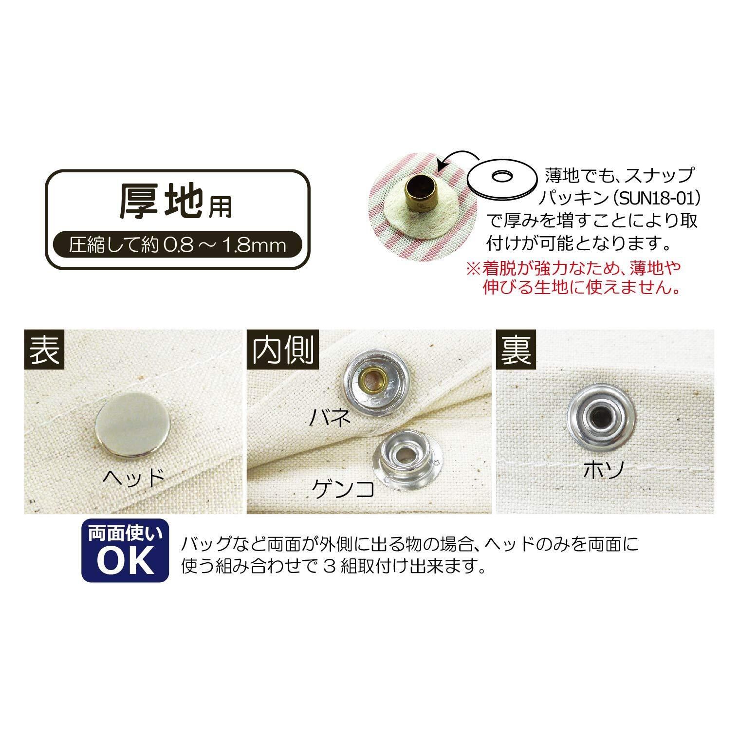 ※薄地でもスナップパッキン(KIYOHARA品番:SUN18-01)で厚みを増すことにより取り付けが可能。