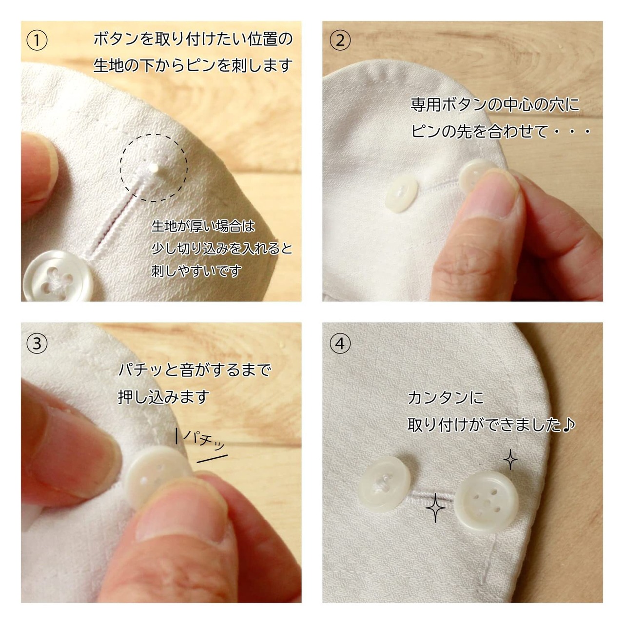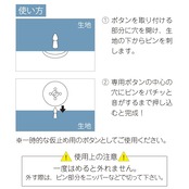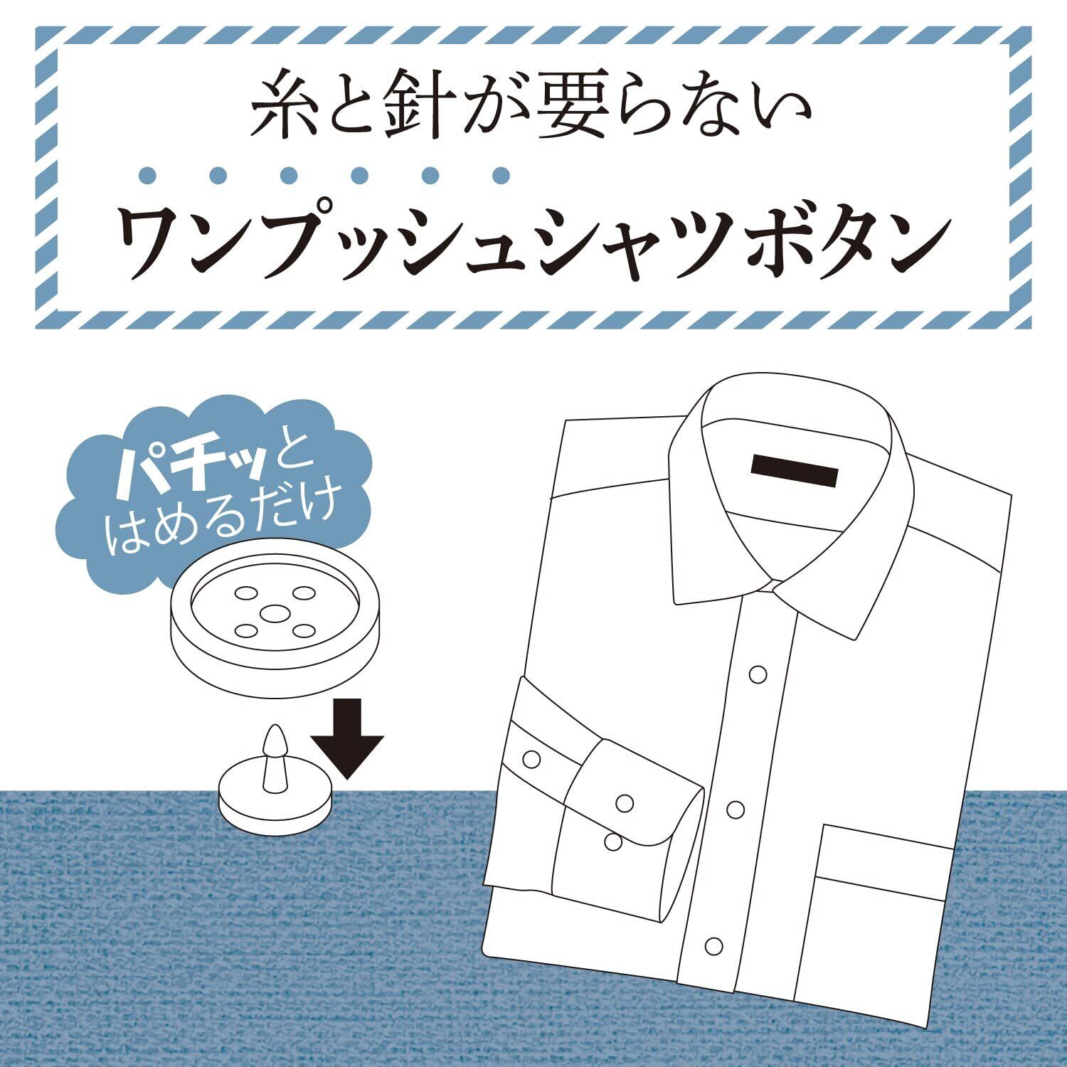 ■サイズ/φ11mm ピンの長さ約4mm ■素材/ポリアセタール ■原産国/日本 ■入数/4セット入 糸と針が要らないシャツボタンです。 【使い方】 1. ボタンを取り付ける部分に穴を開け、生地の下からピンを刺します。 2. 専用ボタンの中心の穴にピンをパチッと音がするまで押し込むと完成! ※一度はめると外れません。外す際は、ピン部分をニッパーなどで切って下さい。