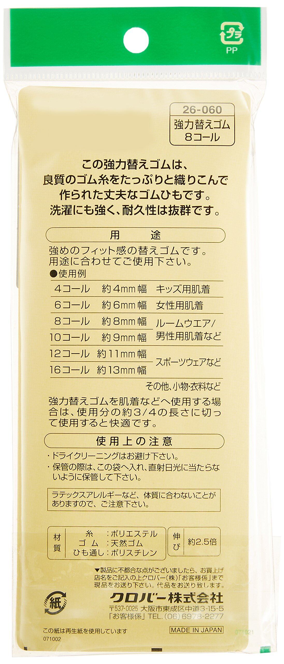 この強力替えゴムは、8コールの設計で、優れた伸縮性と強度を持っています。しっかりとした作りで、衣類のウエストやその他の用途でも安心してご利用いただけます。