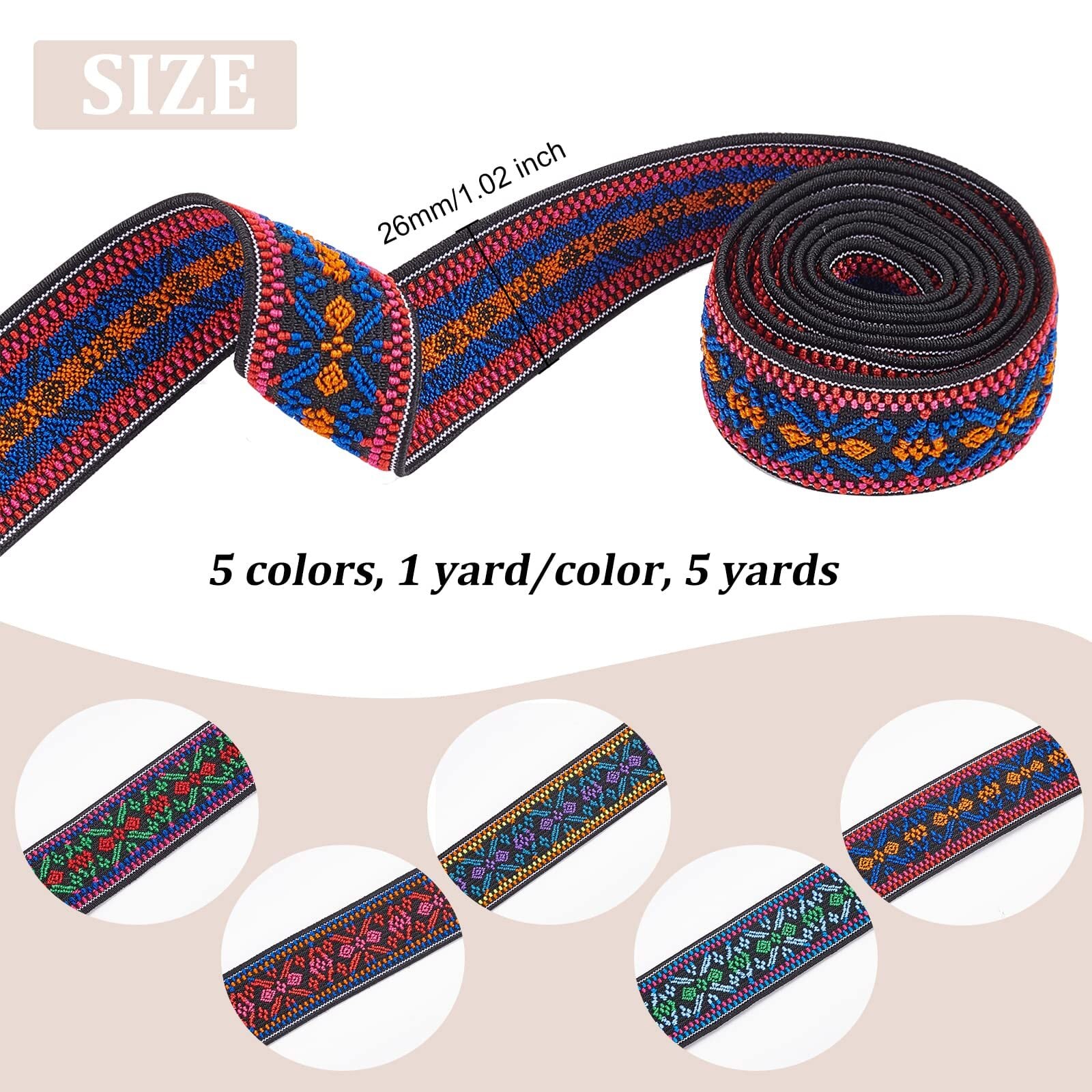 BENECREAT 5ヤード5色 織ゴム 弾性ゴム 幅約26mm ポリエステル ボヘミアンスタイル 平ゴム 刺繍 強い弾性 弾性バンド 交換バンド 伸縮性バンド 服 ベルト交換 手芸裁縫 裁縫材料 手作り素材