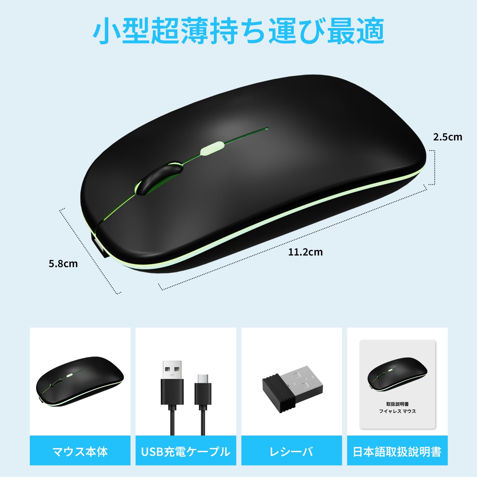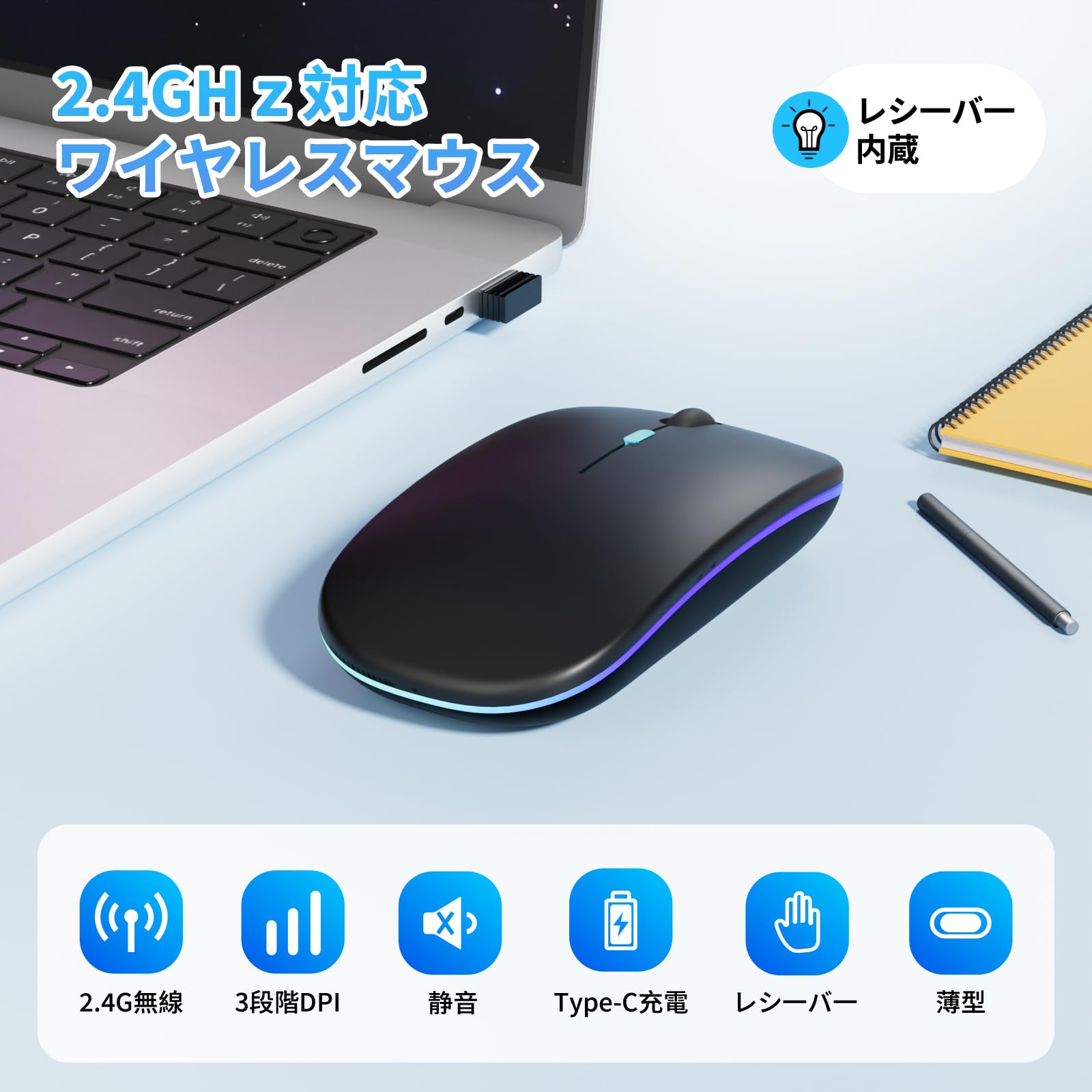 マウス 無線 ワイヤレスマウス【超薄型&Type-C充電式】静音3DPIモード2.4GHz 7色ライト光学式 節電モデル 持ち運び便利 簡単接続 小型 高耐久性 パソコン Windows Mac PC対応 (ブラック)