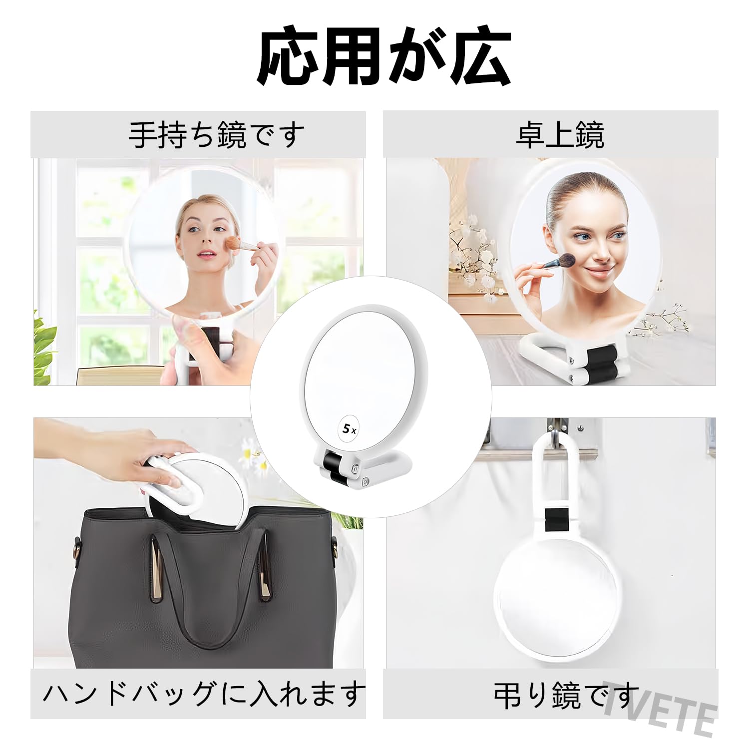 折りたたみ式ハンドル: 手持ち拡大鏡は、手持ち、卓上、吊り下げミラーとして使用でき、フレキシブルなハンドルで、日常使いや旅行に最適です。また、持ち手部分を折りたたむことで、ミラーを垂直に立て、卓上ミラーとして使用することもできる。