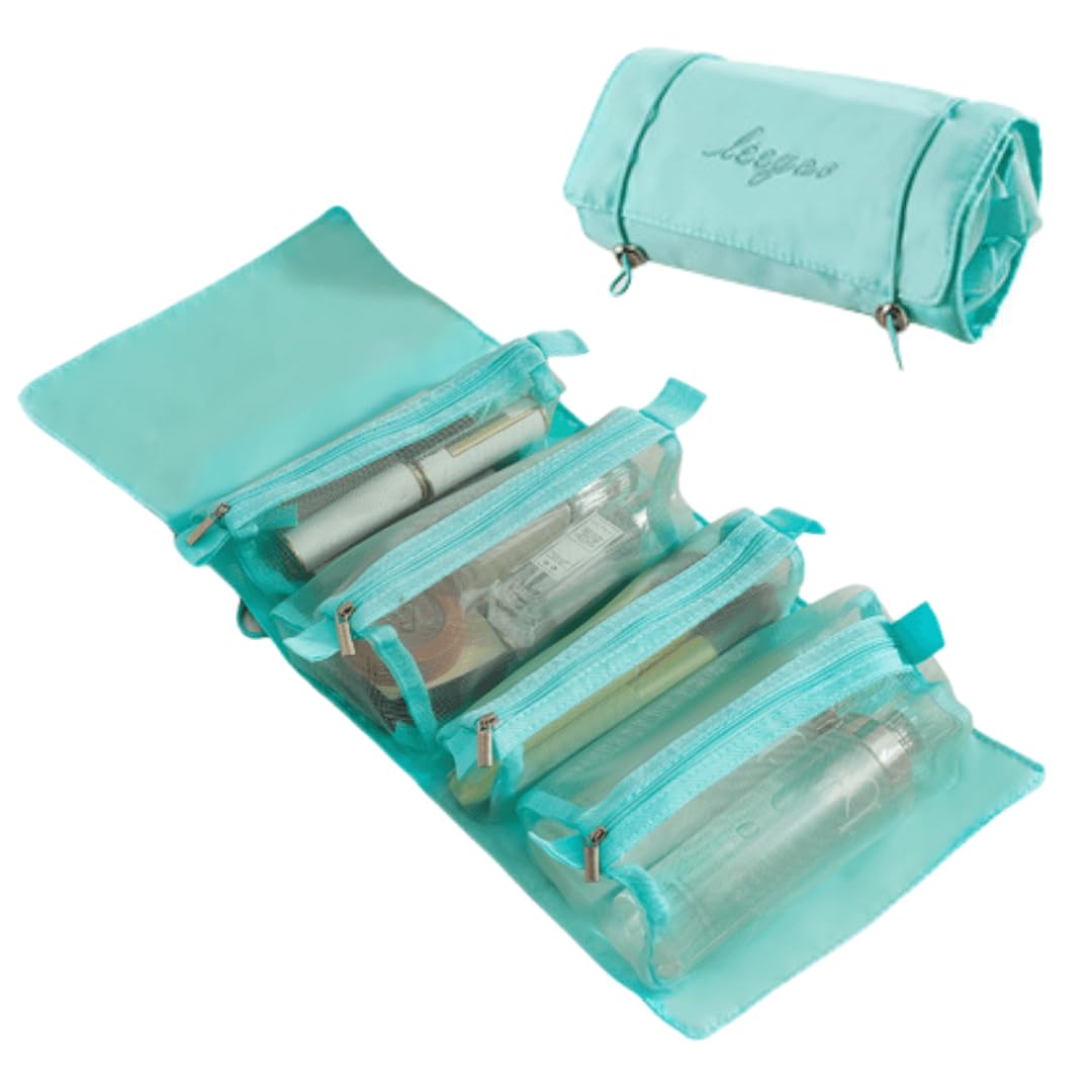 【大容量・多用途】色々入れても、クルッと丸めて形が収まるところがいいです。洗面、スキンケア、ヘアケア、ケーブルなど、小物を分けて入れられます。1個1個のポーチが外れるのも、旅行の支度の時、あちこちから持っていきたい物を集めて来るときに便利でした。仕分けが探しものが苦手な人にとって、ポーチが小分けになっているところも便利です。