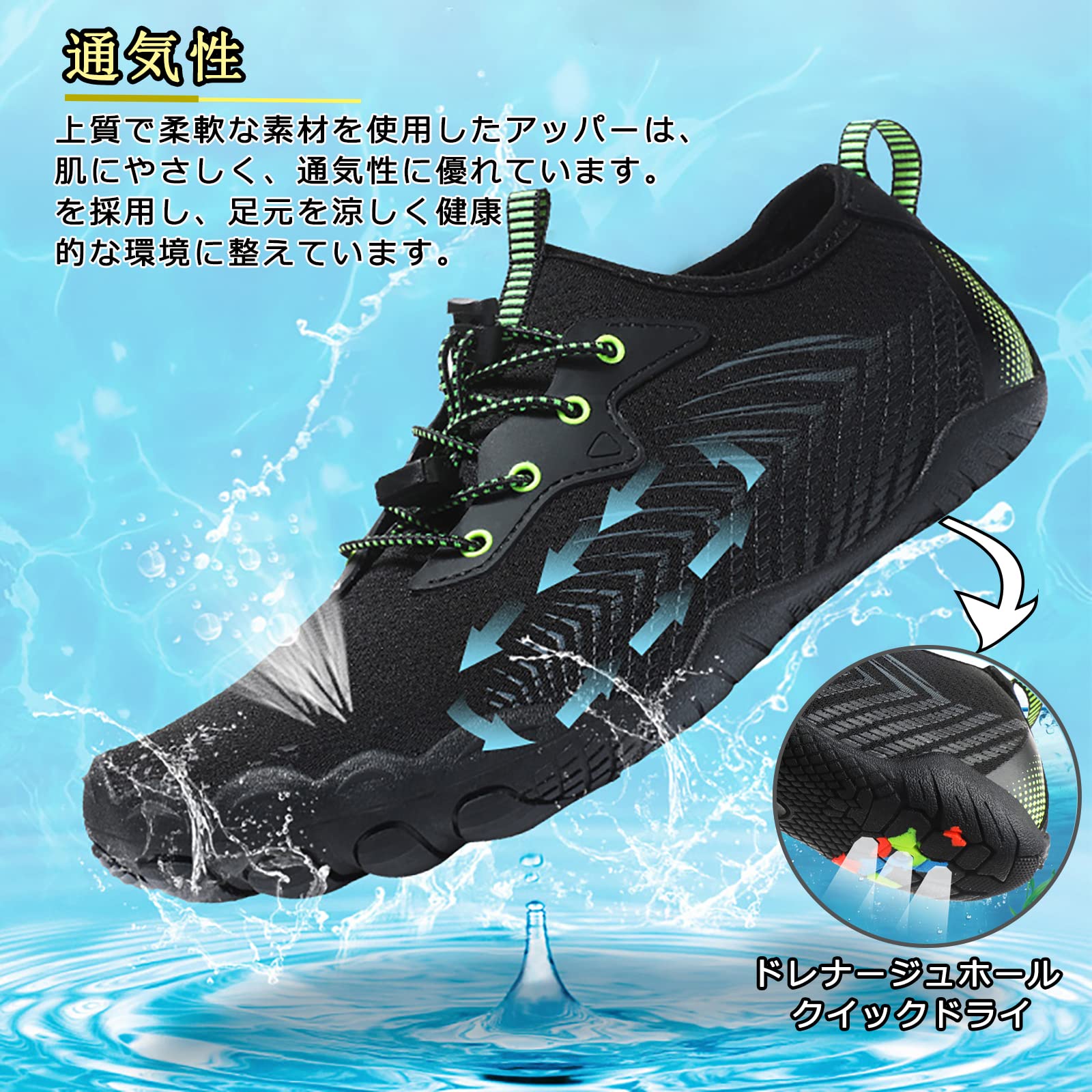 【速乾性】ウォーターシューズは、靴が濡れてもすぐに水が流れ出ることをします。また、靴の通気性が良いので、足の汗を防ぐことができ、足に乾燥した快適で健康的な環境を作り出します。