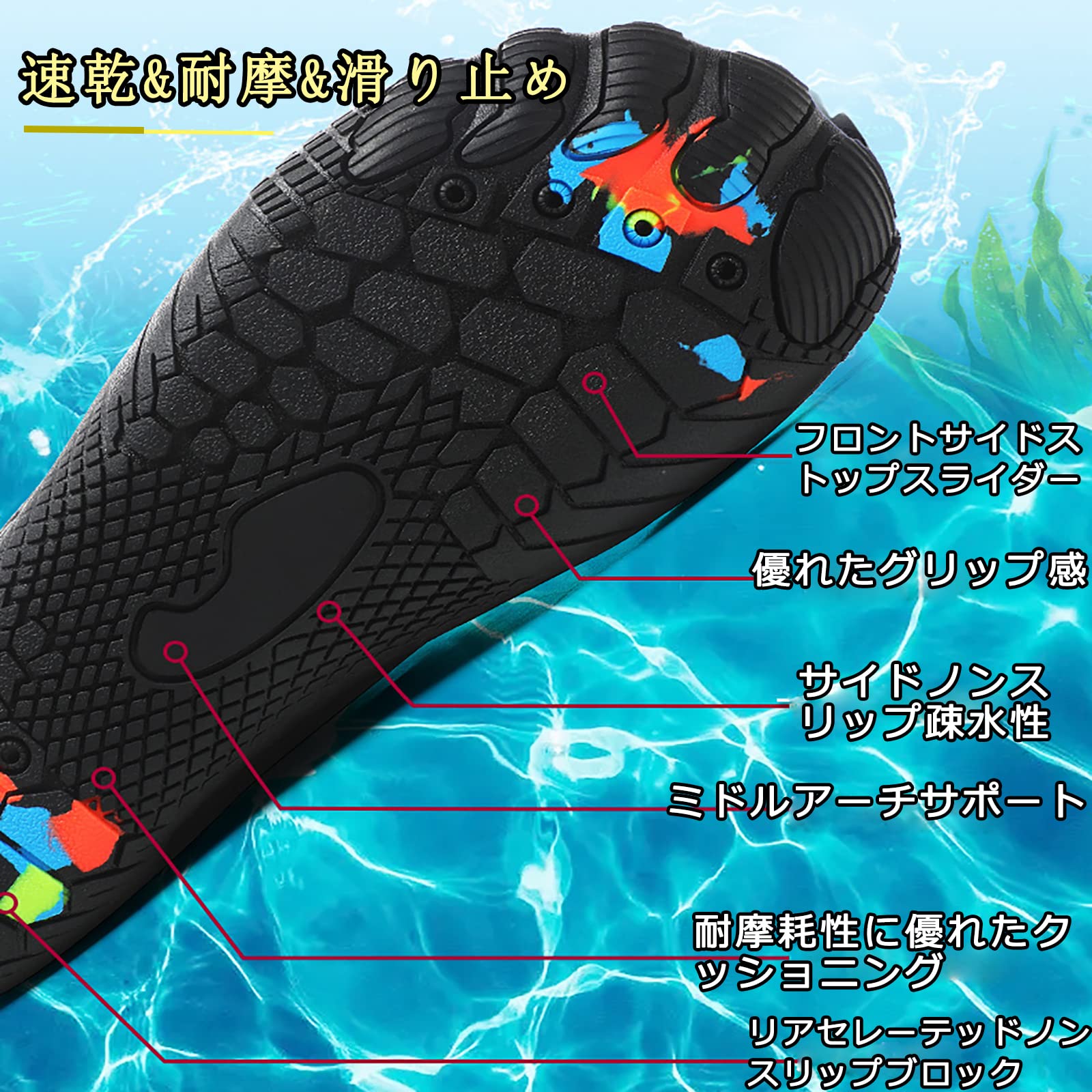 【耐久性&滑り止め】丈夫で滑りにくいゴム底なので、強力なグリップ力で、お客様を安全に導きます、プールの横や野生で滑るのを防ぎます。ユニークで耐久性のあるソールは、各底に穴を開け、より涼しく健康な靴環境を作成するそれらの適切な水の流れを確保し、速乾性、ウォータースポーツ中に超快適。