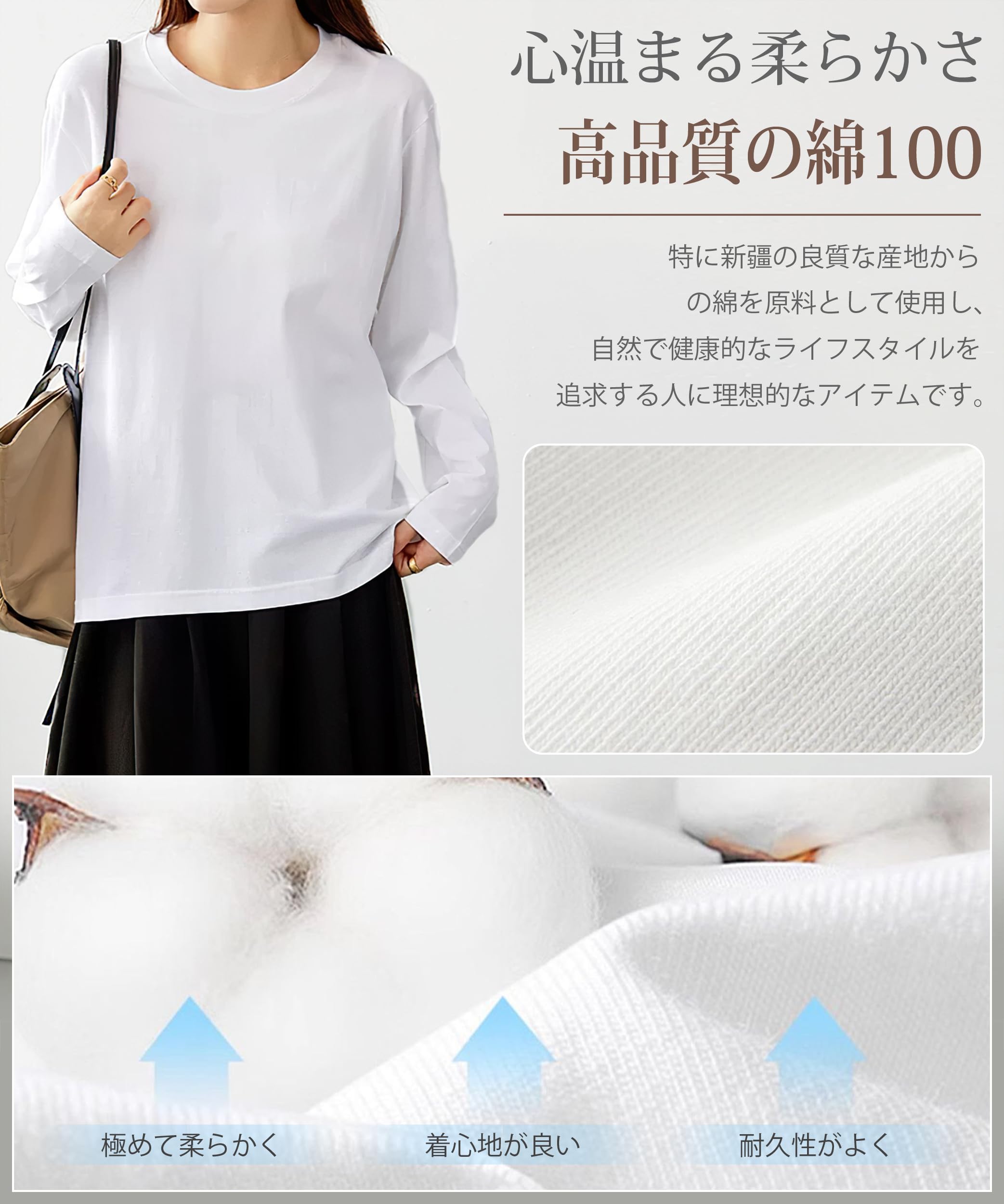 【心温まる柔らかさ・綿100】 この新しい220グラムの重量パンド Tシャツ レディース 長袖は、特に新疆の良質な産地からの綿を原料として使用しています。この高品質のコットン素材は、肌触りがきめ細かく、肌触りが良いだけでなく、極めて柔らかく、着心地が良い。さらに、サイドには切れ目や継ぎ目、縫い目がないシームレス仕様で、体に直接着けても安心感があり、快適です。 毎日のレジャーや軽い運動に最適で、自然で健康的なライフスタイルを追求する人に理想的なアイテムです。