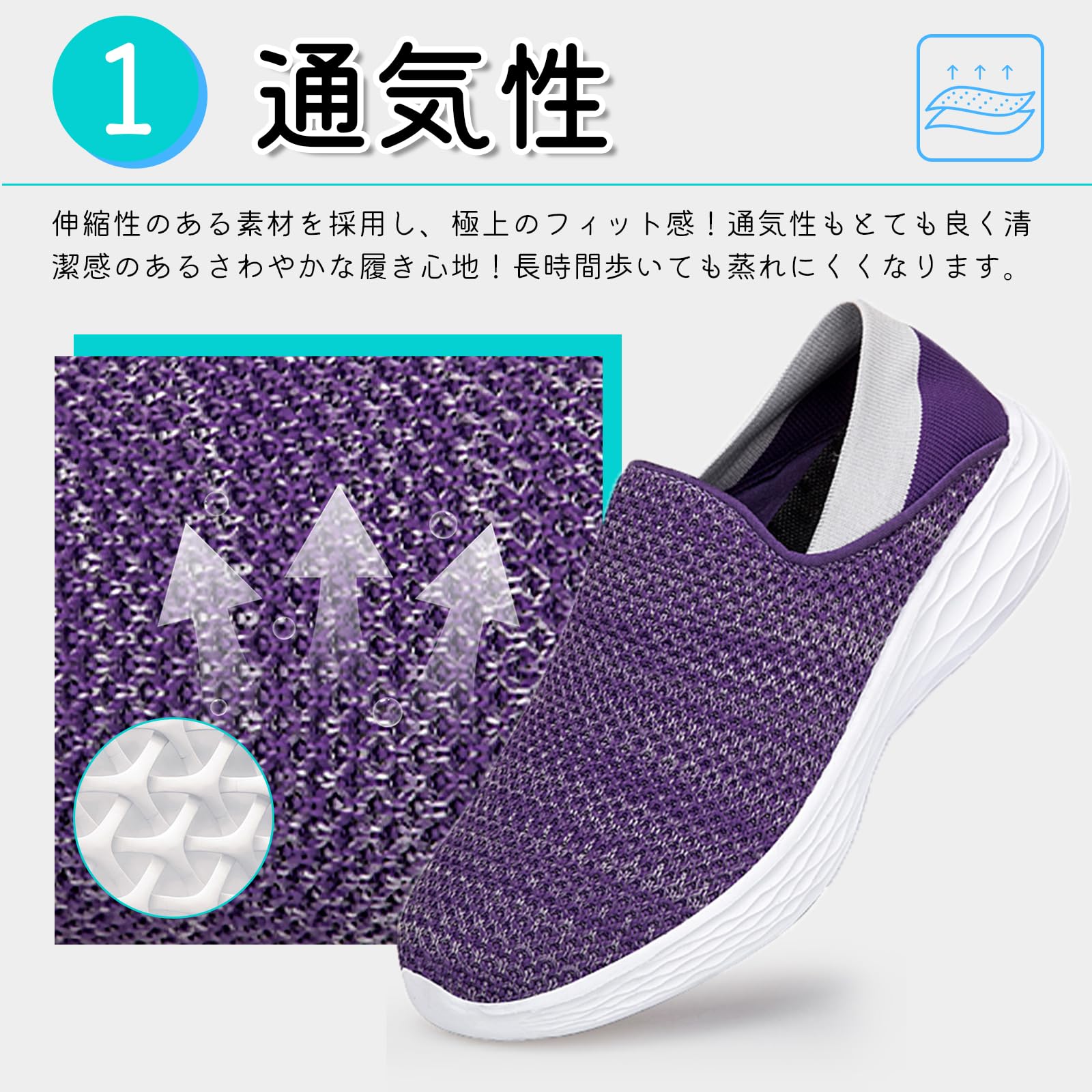 【通気性】伸縮性のある素材を採用し、極上のフィット感!通気性もとても良く清潔感のあるさわやかな履き心地!長時間歩いても蒸れにくくなります。