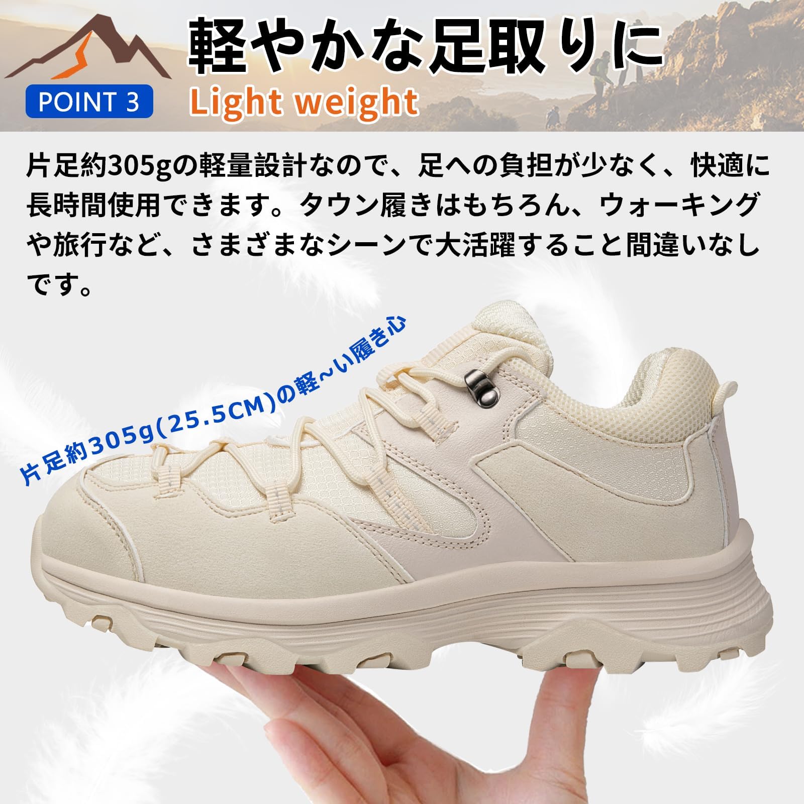 【高透湿性と軽量設計】柔らかな通気性の高いメッシュ素材と軽量な合成レザーを採用したデザインで、軽量化を実現しつつ抜群の通気性を提供します。長時間の歩行でも快適な履き心地を確保し、ぴったりと足にフィット。日常のウォーキングや都会の散策、さらにはアウトドアのハイキングにも気軽に対応できる万能な靴です。