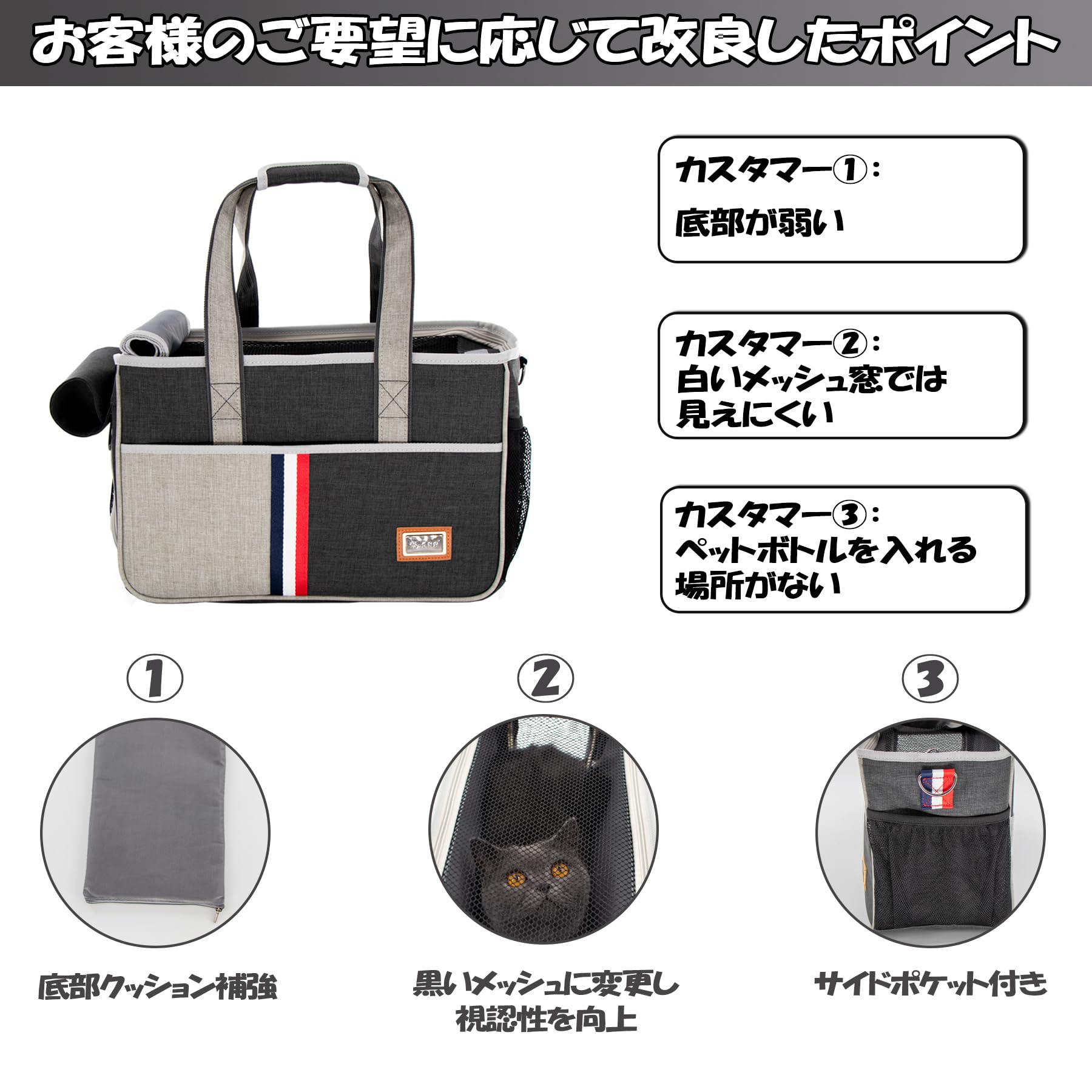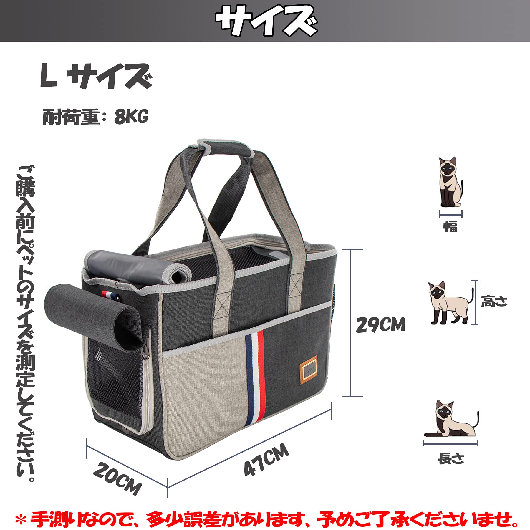 サイズ&改良点:長さ 47.00cm高さ 29.00cm 幅 20.00cm 重量 1.25kg 推奨最高体重:8kg *手測りなので、1~2CMの誤差があります。ペット・キャリーの前後にポケットは二箇所ありますので、小物は大丈夫です。改良点①底部クッションの補強 改良点②ブラックメッシュを採用しており、通気性が良いだけでなく、視認性も向上 改良点③側面にペットボトルやマグボトルなどが収納出来ます。