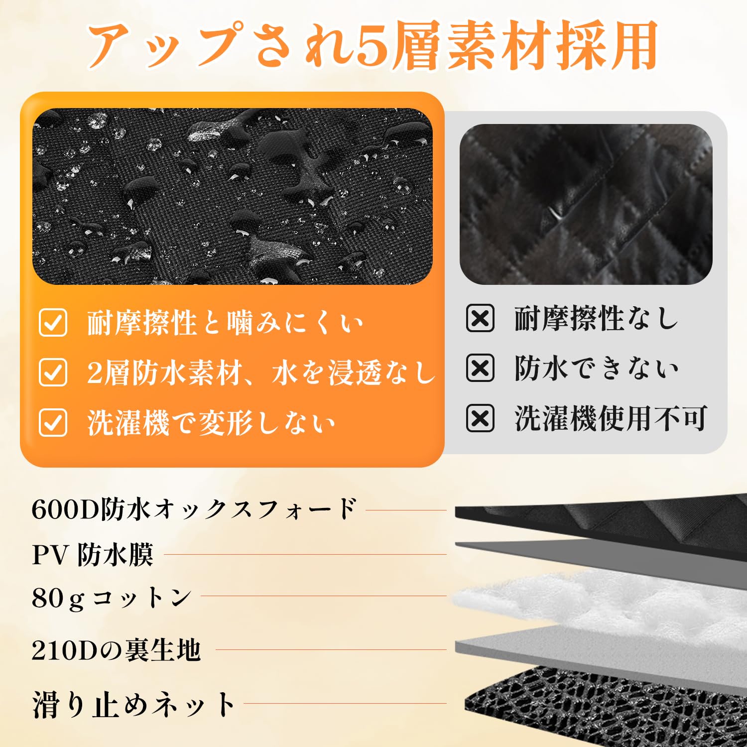 【アップされ5層素材構造】前の2層素材より犬 ドライブシート素材は5層構造を改良しました。600D防水オックスフォード+PV 防水膜+80gコットン+210Dの裏生地++滑り止めネットを採用しております。本体素材は防水性、耐摩耗性と耐傷性あり、ドライブ途中で犬がおしっこをしても水が染み込まず、雨や雪の日でも座席をしっかりカバーして、汚れや犬のひっかき傷、毛、泥などの損傷からご愛車を解放します。