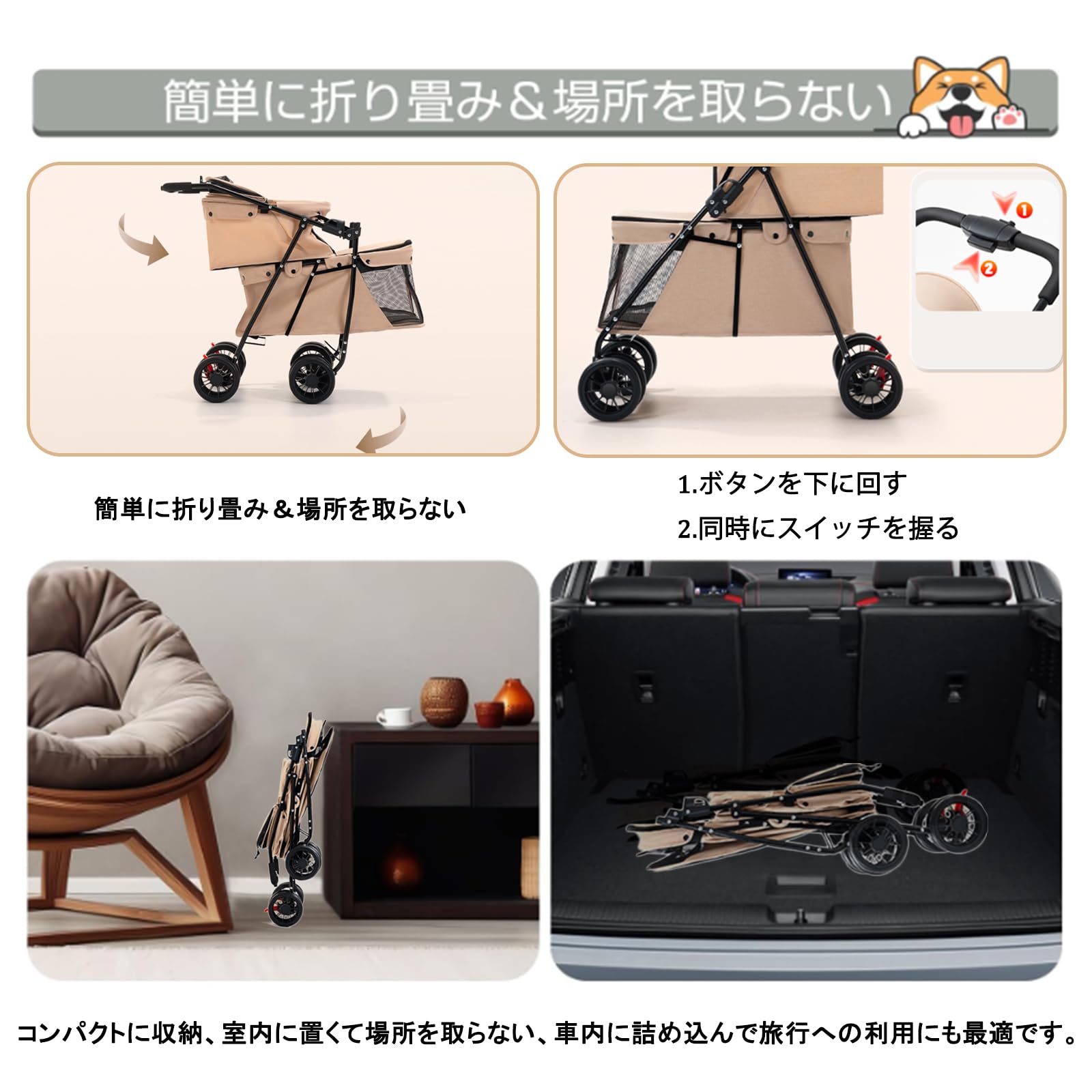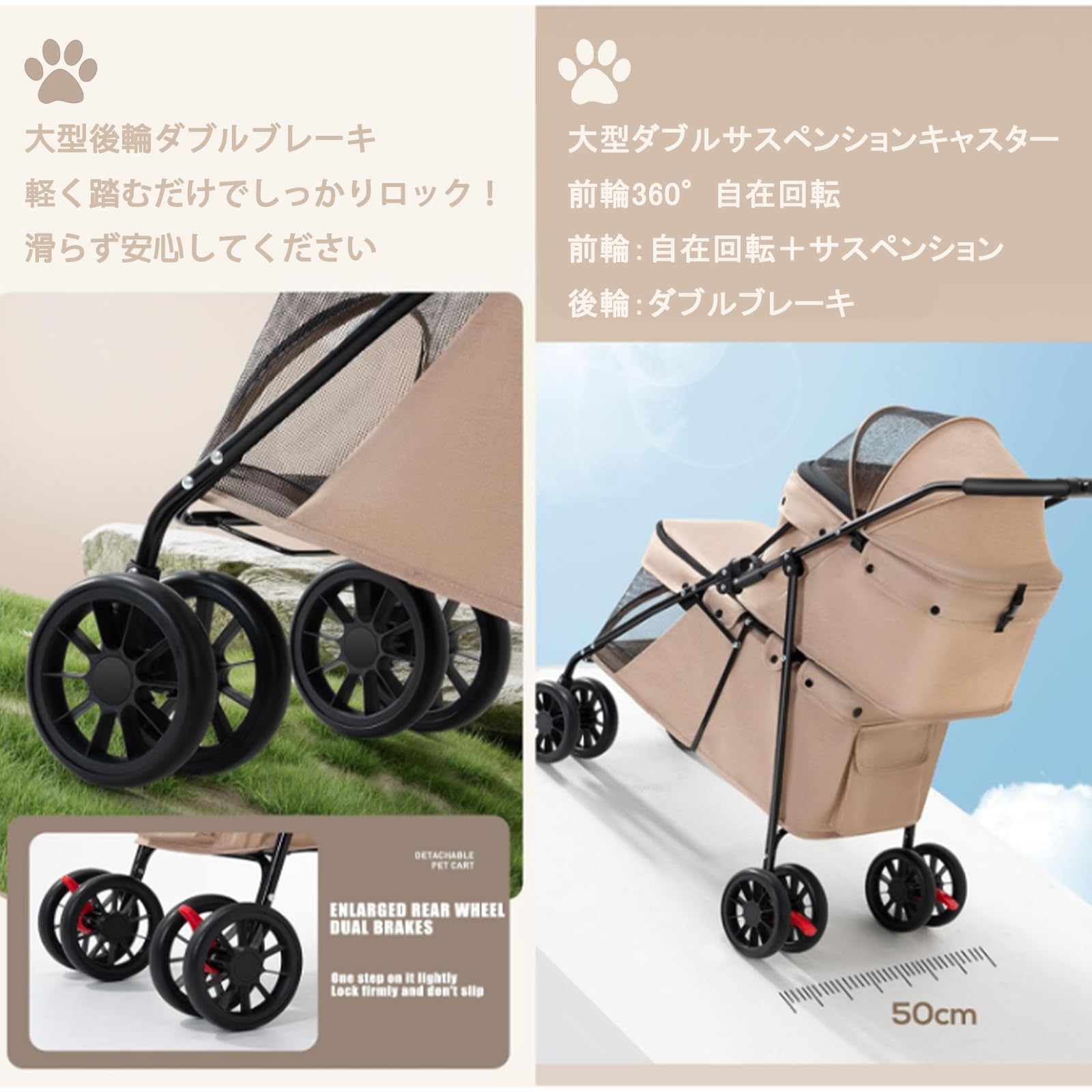 [SAQIANRE] ペットカート 折り畳み式 多頭 上下2段式 ペットバギー ワンタッチ 犬用ベビーカー コンパクト 収納便利 4輪 前輪360°回転 後輪ブレーキ付き 猫 小型犬多頭 中型犬 犬猫兼用 ドッグカートお出かけ 散歩 通院 介護用 (ブラウン)
