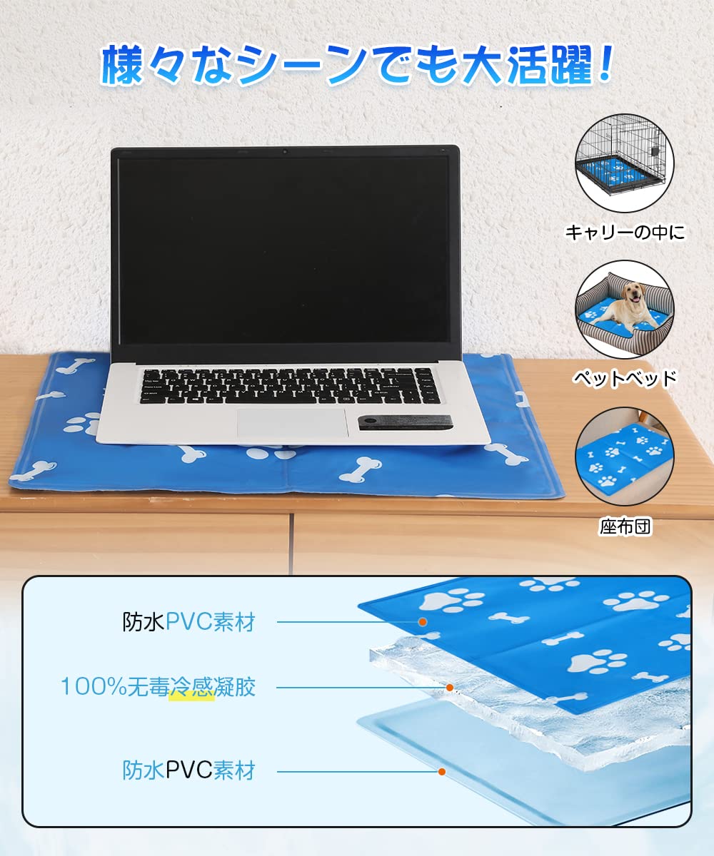 【夏用ペットひんやりマット】ペット冷感マットは、高品質のPVC素材を採用し、防水性、耐摩耗性、耐久性に優れています。ひんやりマッドの中には100%高分子ゲルで、高い熱伝導性と拡散性を持つ冷感ジェルで、体の熱を吸収して自然なヒンヤリ感を提供し、ペットの熱中症対策として暑い夏に最適です!