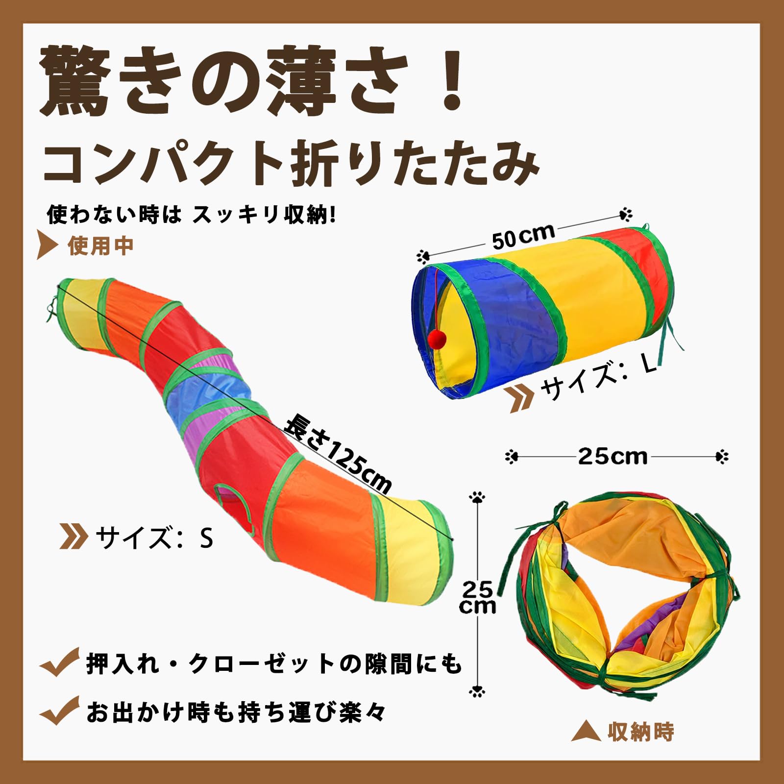 TJT 猫トンネル 長い レインボー トンネル 120cm 可水洗いS形長い2穴付き 折りたたみ式 キャットトンネル 収納便利 猫の遊び場、運動不足解消、ストレス発散 (虹色 S)