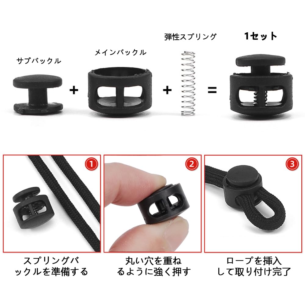 【使いやすいスプリングデザイン】スプリング式のボタンにより、紐の緩めや締め付けが驚くほど簡単に行えます。このデザインは特に、テントやバックパック、スポーツウェアなど、様々な装備品において便利です。手元での操作だけでなく、実際の使用環境でも極めて使い勝手が良いため、アウトドアや日常生活での活躍が期待できます。