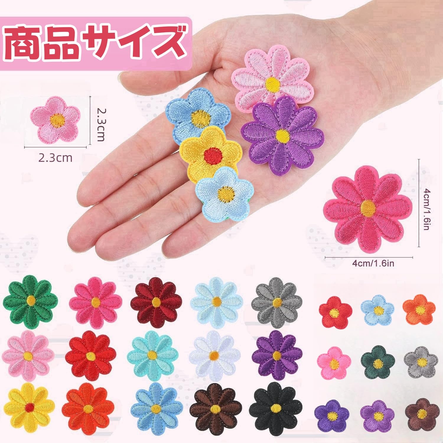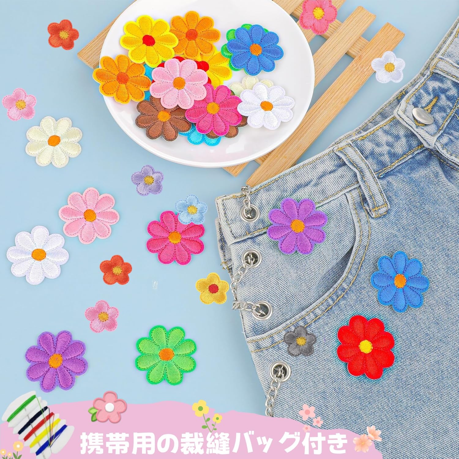 【50個お得セット】鮮やかな色、精緻な作業で生産したアイロン対応可愛いワッペン/アップリケ50枚セットです。大人気な花の刺繍ワッペンセット、22色の小さな花モチーフと28色の大きい花モチーフがあります。(携帯用の裁縫バッグ付き)寸法:高さ縦約2.3cm×横幅約2.3cmと高さ縦約4cm×横幅約4cm(立体感と光沢が有り高級なイメージ)