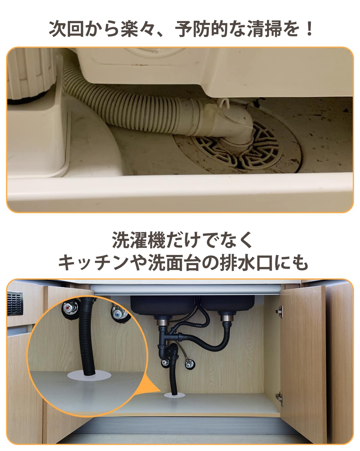 【多機能排水口カバー】この洗濯機排水口カバーは、洗濯機の排水口だけでなく、キッチンや洗面台の排水溝カバーとしても適用可能です。ほこり、汚れ、虫の侵入、異臭を防ぎ、清潔で快適な環境を維持します。