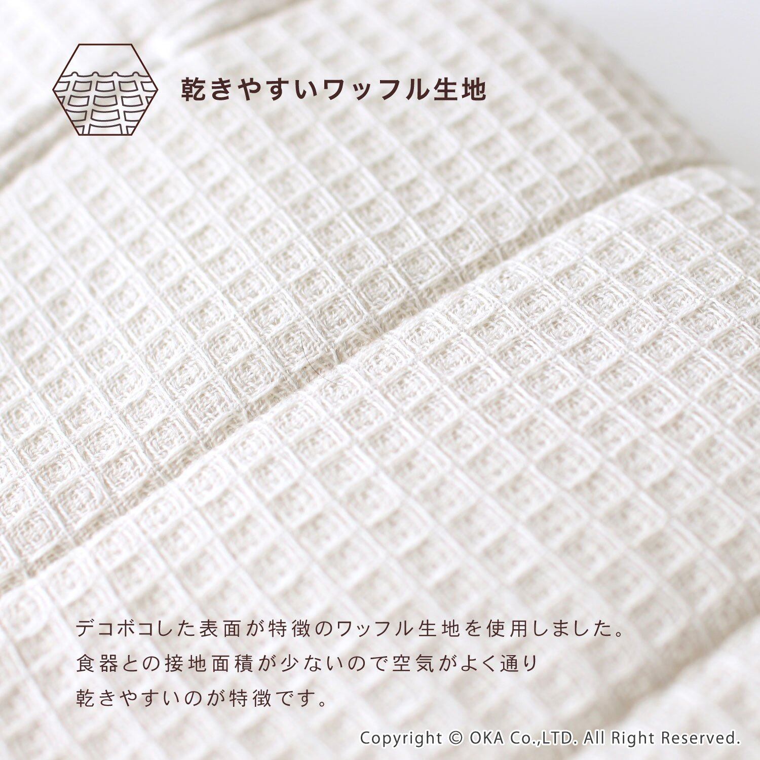 グラスやカラトリー、口に触れる物を置く場所なので安心な素材を使っています。デコボコした表面が特徴のワッフル生地を使用しました。食器との接地面積が少ないので空気がよく通り、乾きやすいのが特徴です。
