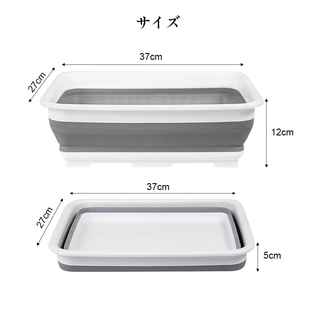 サイズ:この折りたたみ洗い桶の展開後のサイズは37*27*12cmで、折りたたみ後の高さは5cmです。満水容量は約8Lです。色はグレーとブルーがあります。