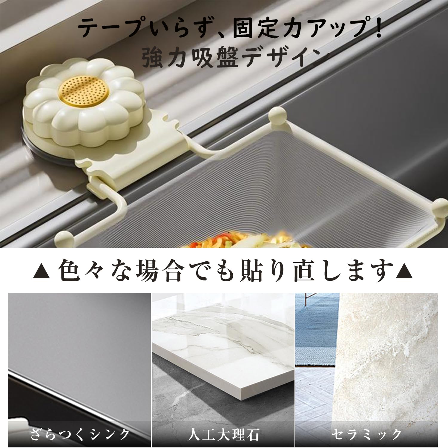 【強力吸盤でしっかり固定・繰り返し使える】ツルツルした壁面やシンクに吸盤で簡単に取り付け可能。粘着テープのように跡が残らず、取り外して何度でも繰り返し使えます。必要なときだけサッと設置できるので、料理中や掃除中の移動もラクラク。安定感が高く、倒れたりずれたりする心配も少ない設計です。