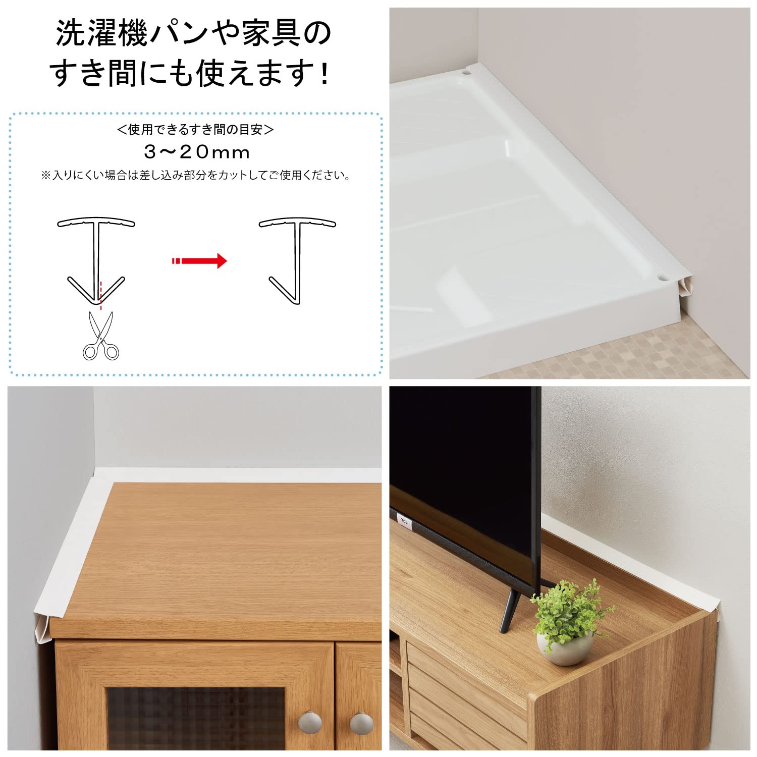気になるすき間に差し込むだけでほこりや水はねをブロック、接着剤などが不要なので取り外しも簡単です。