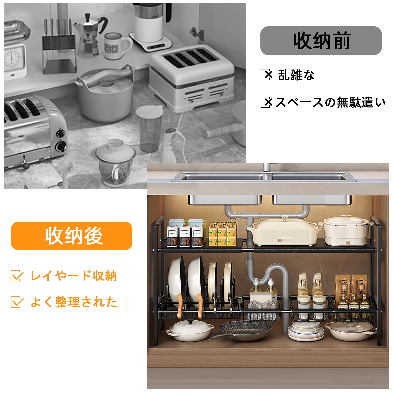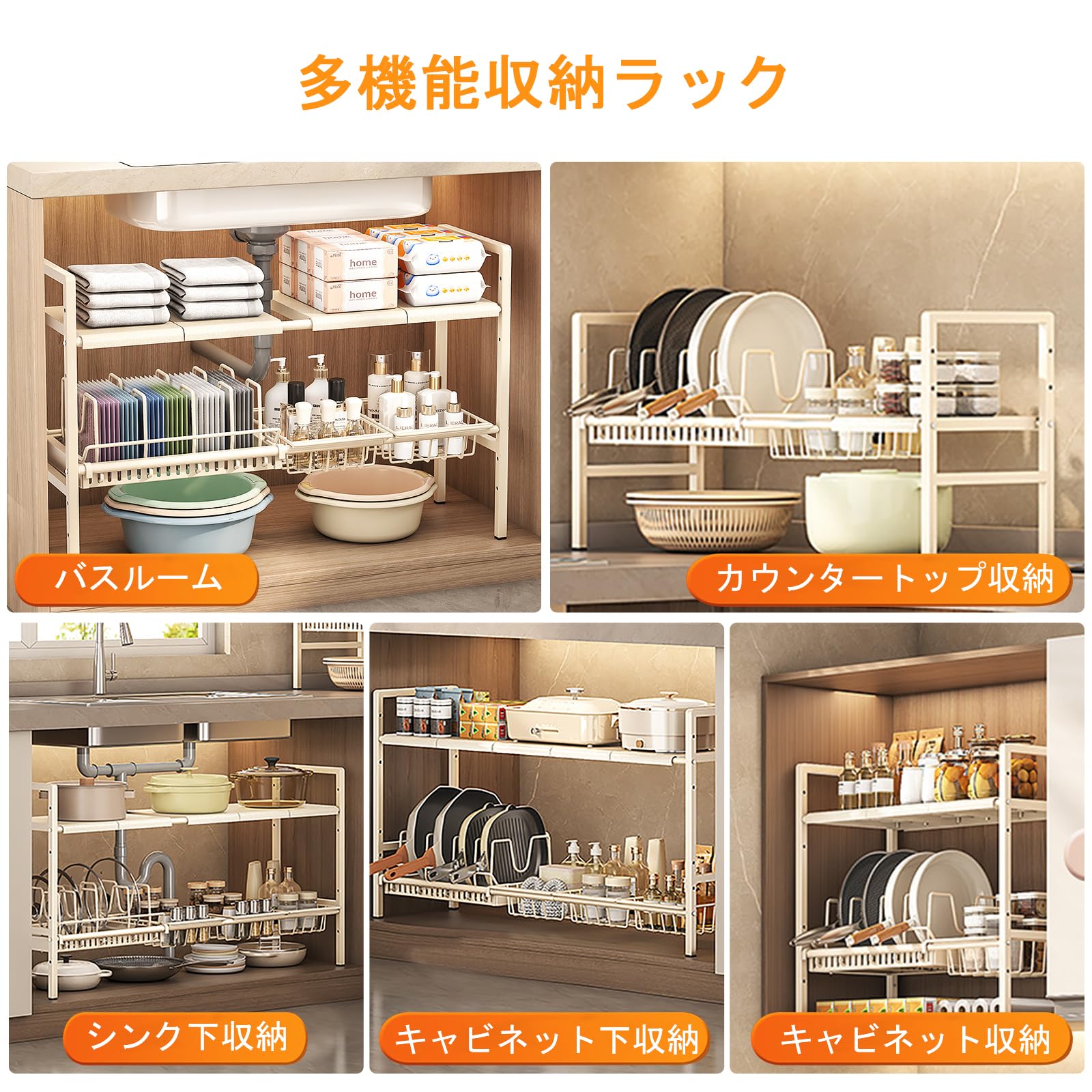 製品仕様:幅53-88×奥行25×高さ44cm、収納バスケット:26×16.5×7cm、シンク下伸縮棚は変形しない厚手の素材でできており、丈夫で耐久性があります。キッチン、バスルーム、シンク下、ワードローブなど、あらゆる場所に適しています。鍋やフライパンなどの重いものを収納することができ、変形することなく安全でしっかりしています。