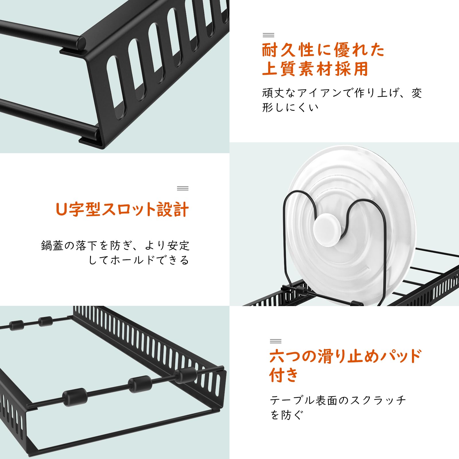 「頑丈な金属製」 製品全体は耐久性に優れたアイアン製で、通常のフライパン、鍋、鍋蓋、プレートなどに耐えられ、長時間使用しても簡単には変形しません。ご注意:より長くご愛用いただけるためには、できるだけ通気性のいい場所に設置し、長時間水に浸らないようにご注意ください。