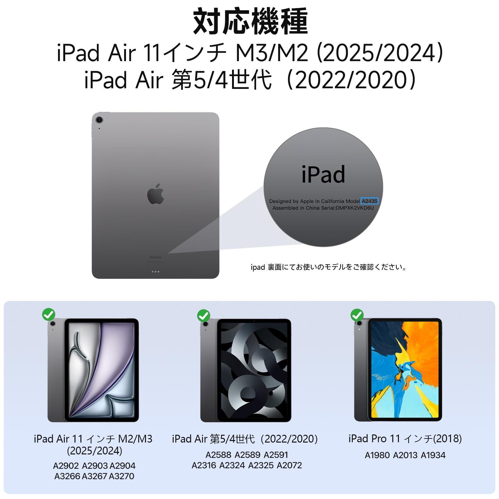 【適用機種】:iPad Air 11インチ M3 2025(A3266 A3267 A3270)、iPad Air 11インチ M2 2024(A2902 A2903 A2904)、iPad Air 第5世代 2022(A2588 A2589 A2591)、iPad Air 第4世代 2020(A2324 A2325 A2072 A2316 ) 、iPad pro 11インチ 第1世代 2018(A1980、A2013、A1934)。他のiPadモデルと互換性がありません、ご購入前、お持ちのiPadのモデル番号をご確認いただきます。