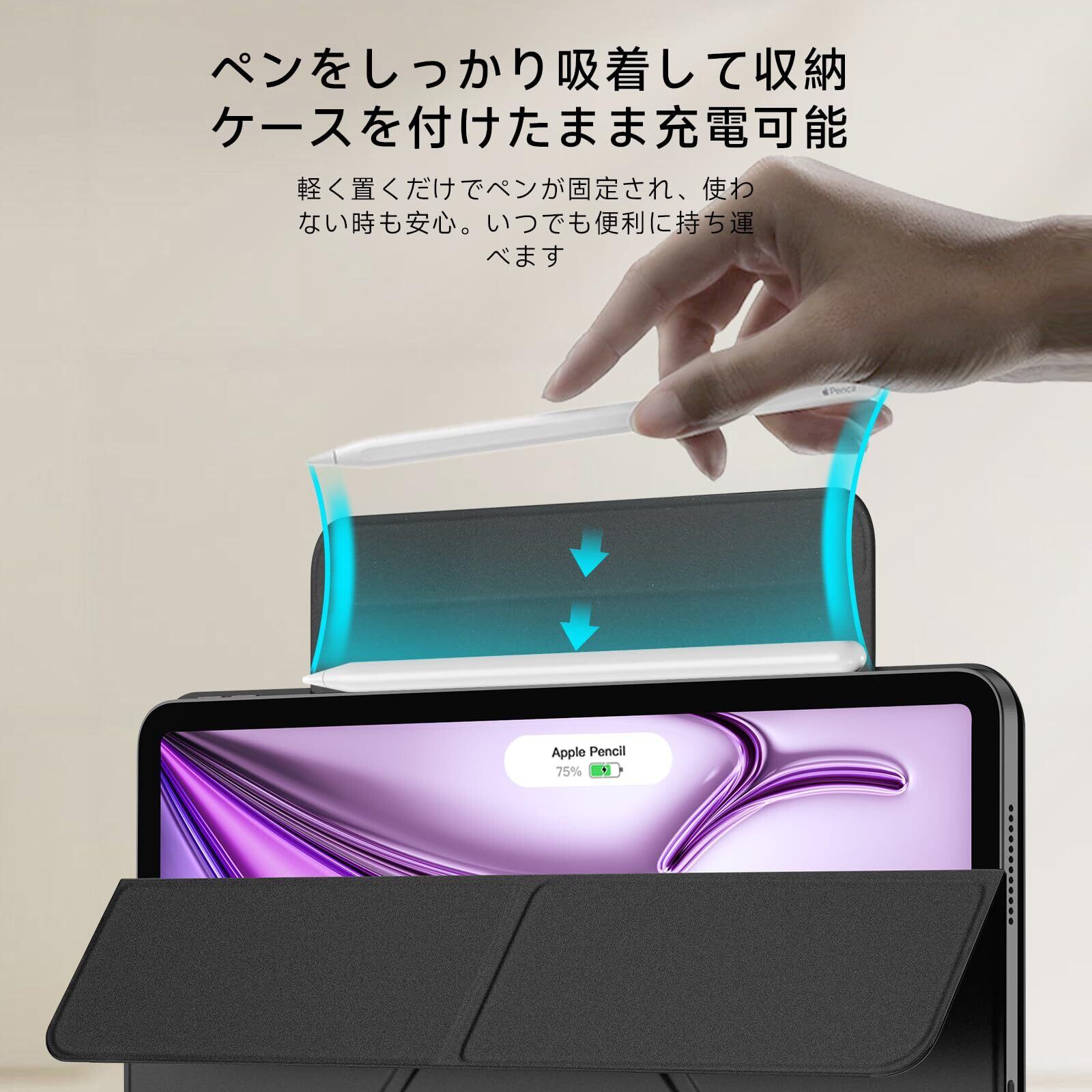 【内蔵式のApple Pencil用ストラップ】隠れたマグネット式ペンシルストラップが、充電中のペンシルをしっかり保持し、外出先での落下を防ぎます。使用しない時はストラップを折りたたんで背面パネルに隠し、ipad air ケースのミニマルでスマートな外観を保つことができます。