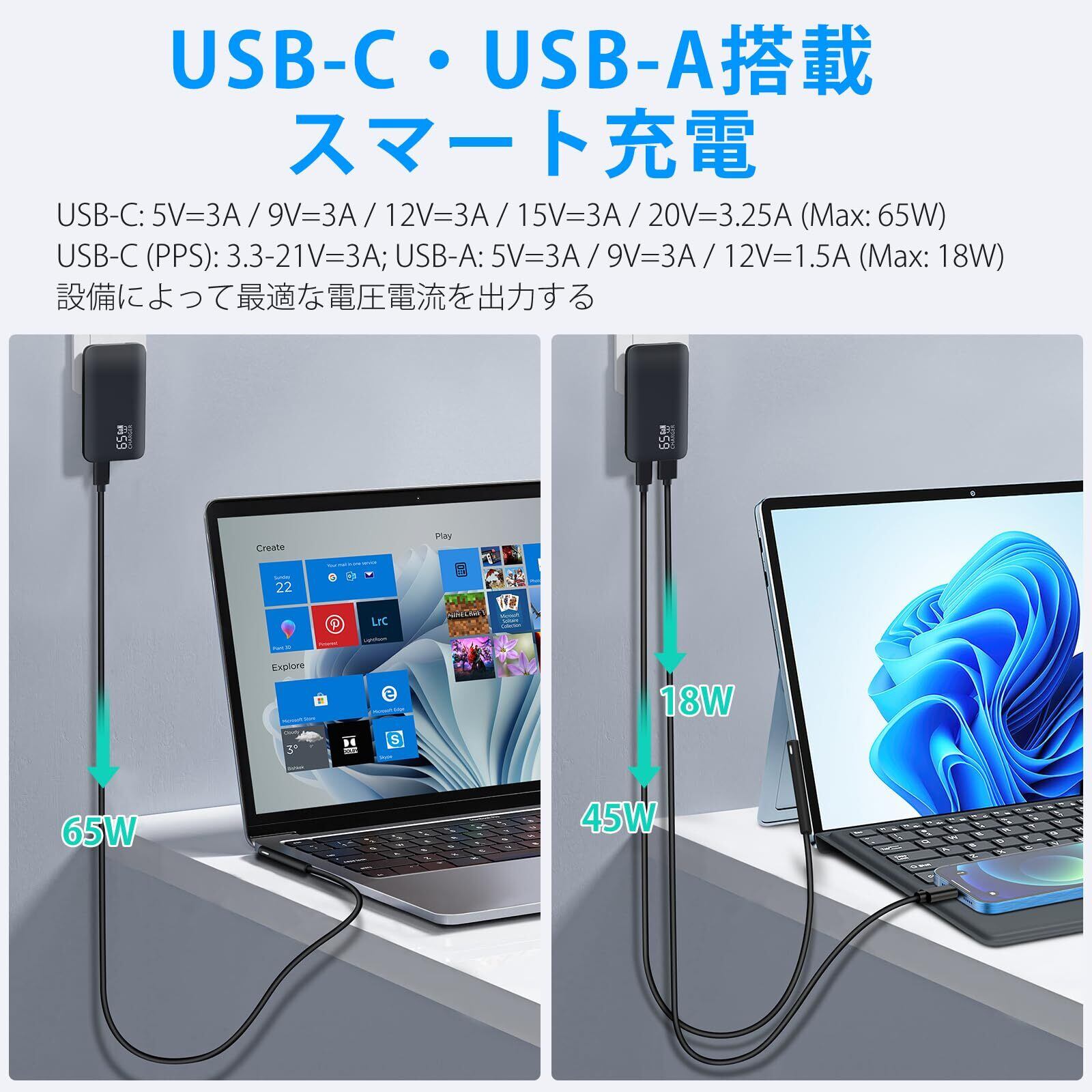Surface充電器 65W/45W サーフェス充電器 PD急速充電 Surface Pro/Surface Go/Surface Laptop/Surface Book互換 折畳式 ACアダプター Surface to USB-C充電ケーブル付き USB-C & USB-Aポート搭載 電源アダプター