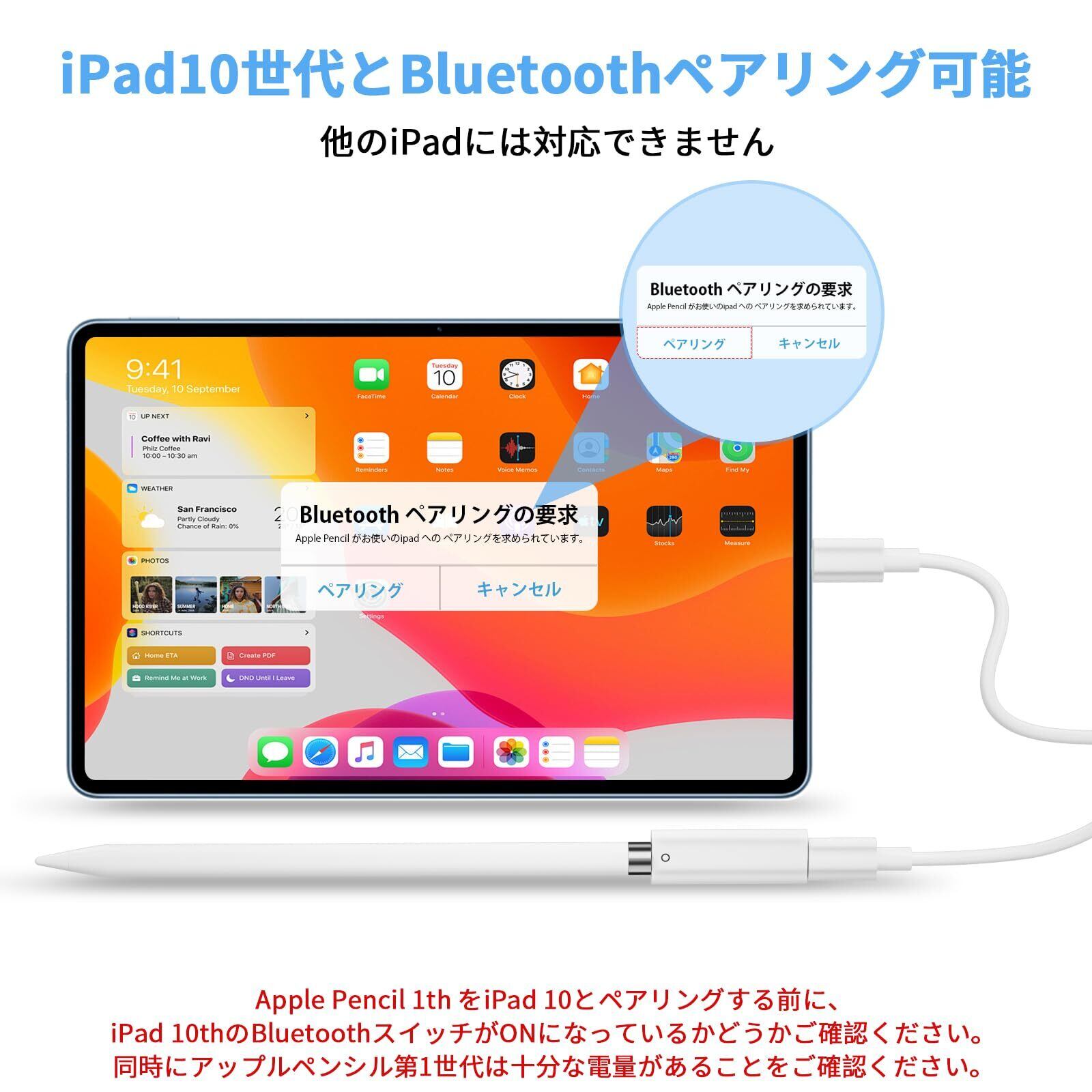 対応ipad第10世代ペアリングとApple Pencil第1世代充電:のUSB-C - Pencilアダプタは対応Apple Pencil第1世代を充電するだけでなく、iPencilをiPad10にペアリングもできる。ペアリング方法-対応Apple Pencilをアダプタのlightingポートに接続し、もう一方(アダプタのタイプCポート)をPad10世代に差し込みます。後で、約 5秒“Bluetooth ペアリングの要求”がipadの第10世代のスクリーンに表示されます。次は [ペアリング] ボタンをクリックすると、ブルートゥース 接続が成功します。
