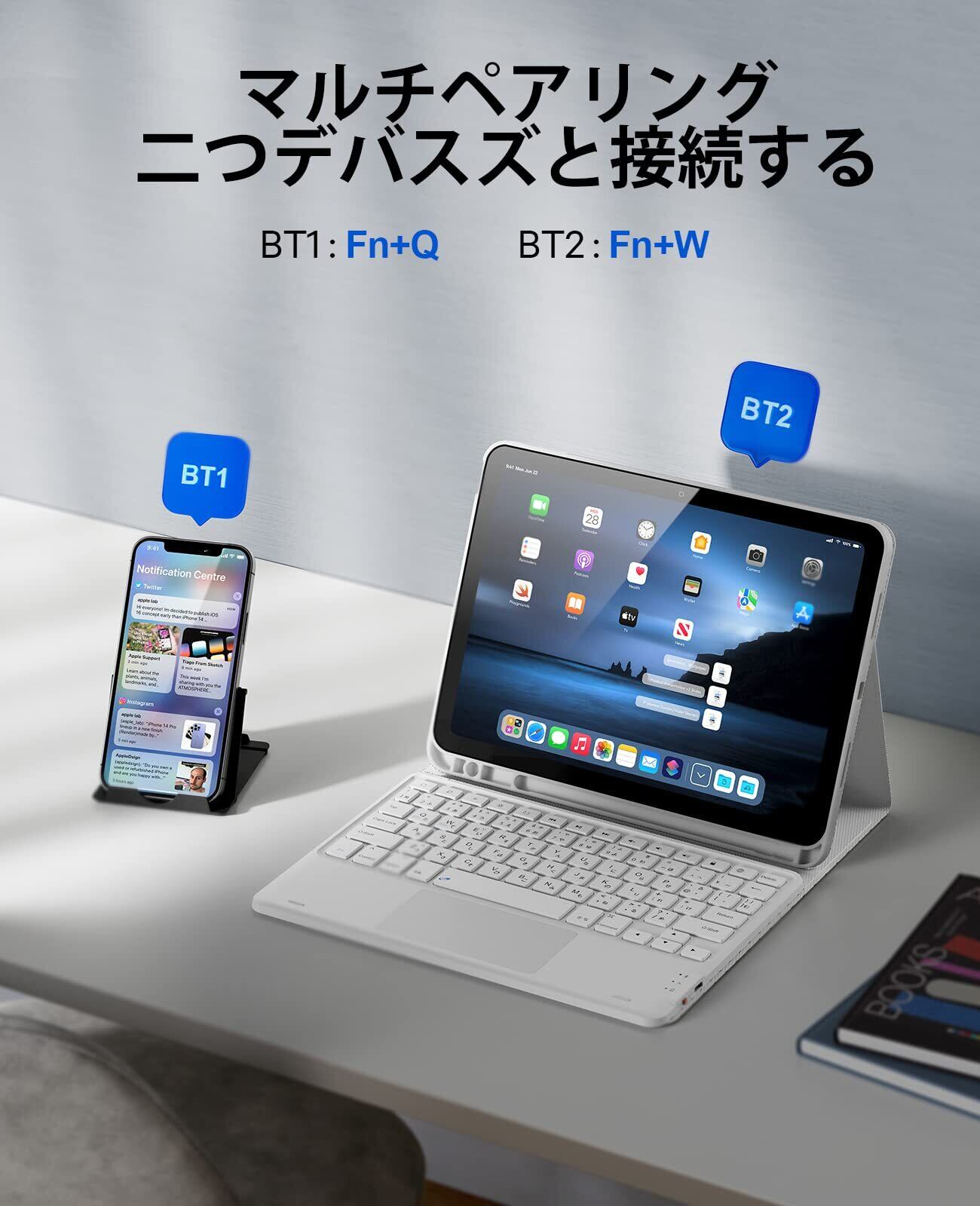 【Bluetooth5.1&マルチペアリング2台切り替え】ipad 10世代キーボードケースはBluetooth5.1機能を搭載し、10メートル以内の伝送範囲で、データ転送速度と安定性も大幅アップすることが楽しめます。二つBluetoothチャネルがあるので、1台マルチペアリングキーボードでiPadやiPhone、ボタンを押すだけで自由に切り替えることができます。(Bluetooth接続のみをサポートします。)