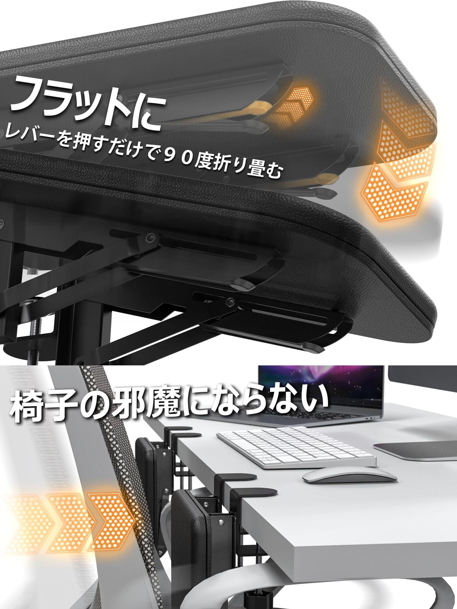 【折り畳み式】90°折り畳み、使用しない時には、取り外す必要ありません。アームレストデスク空間利用に最適です。不規則な形状のテーブルは、5 cmを超える厚さのテーブルは使用できません