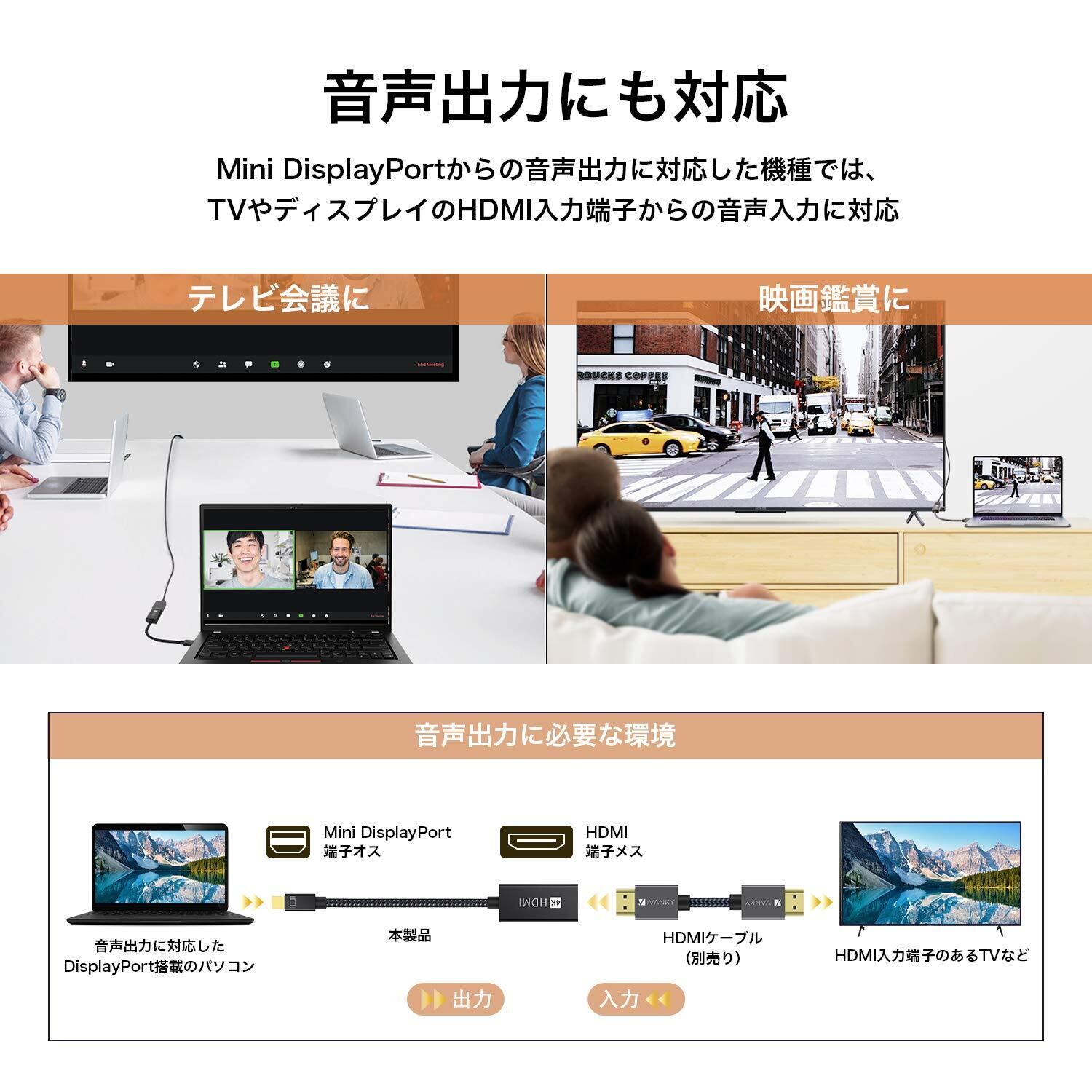 【幅広い互換性】Microsoft Surface、Surface Pro、Surface laptop、Surface Dock、Apple Macbook Air、Macbook Pro、iMac、Mac Mini、Lenovo ThinkPadなど、ミニディスプレイポート・サンダーボルト 端子搭載のパソコンには適用。映像・音声同期出力、ミラーリング・マルチディスプレイ対応、HDCP, 3D, 36-bit Deep Color, 非圧縮・圧縮デジタルオーディオ(7.1ch、5.1ch、2ch)など対応。