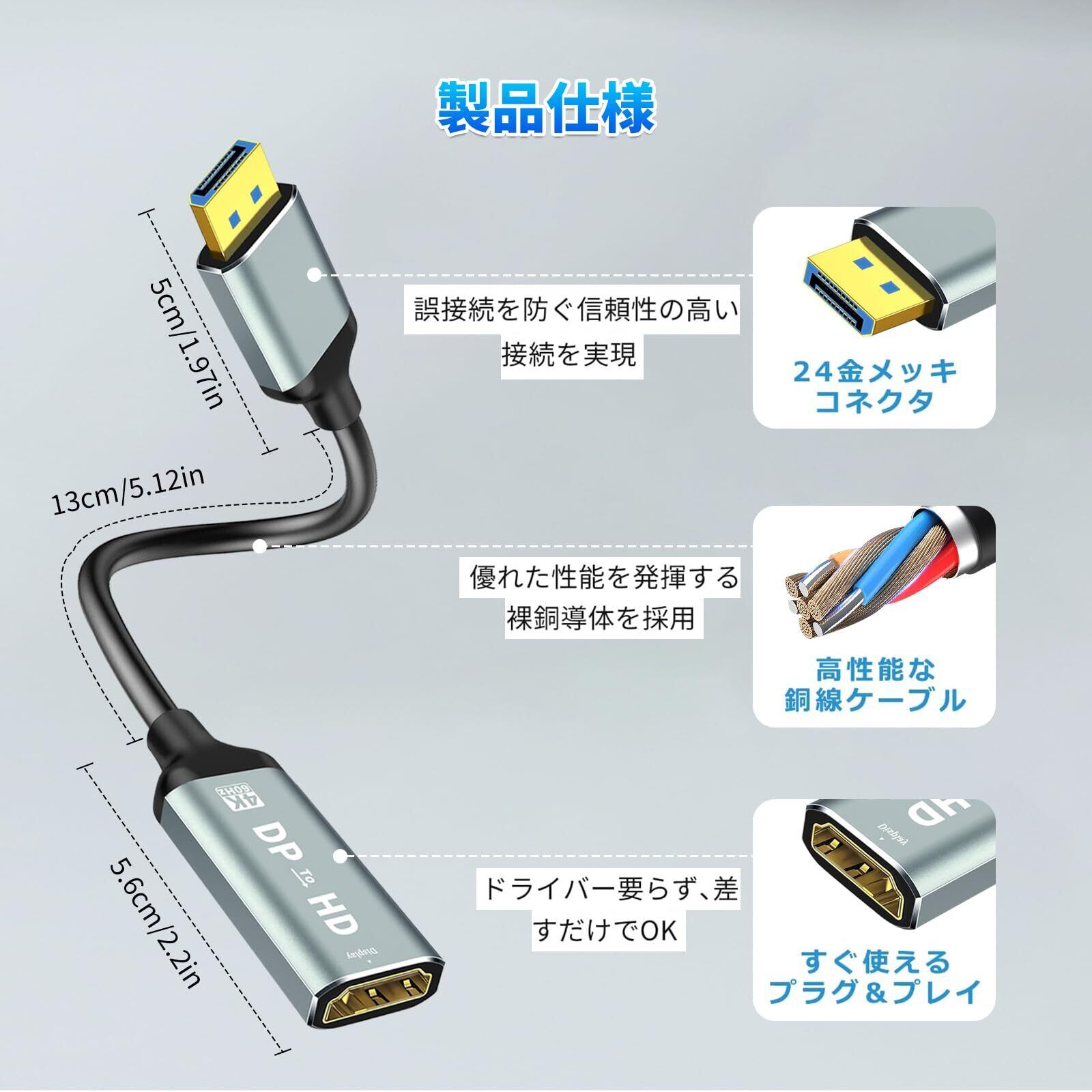 4K@60Hz 高解像度&高速伝送 最大4K(3840×2160)@60Hzの超高画質に対応。2560×1440や1080Pにも対応し、10.8Gbpsの高速転送で映像と音声を遅延なく同期させます。※HDMI→DPの逆方向変換は不可