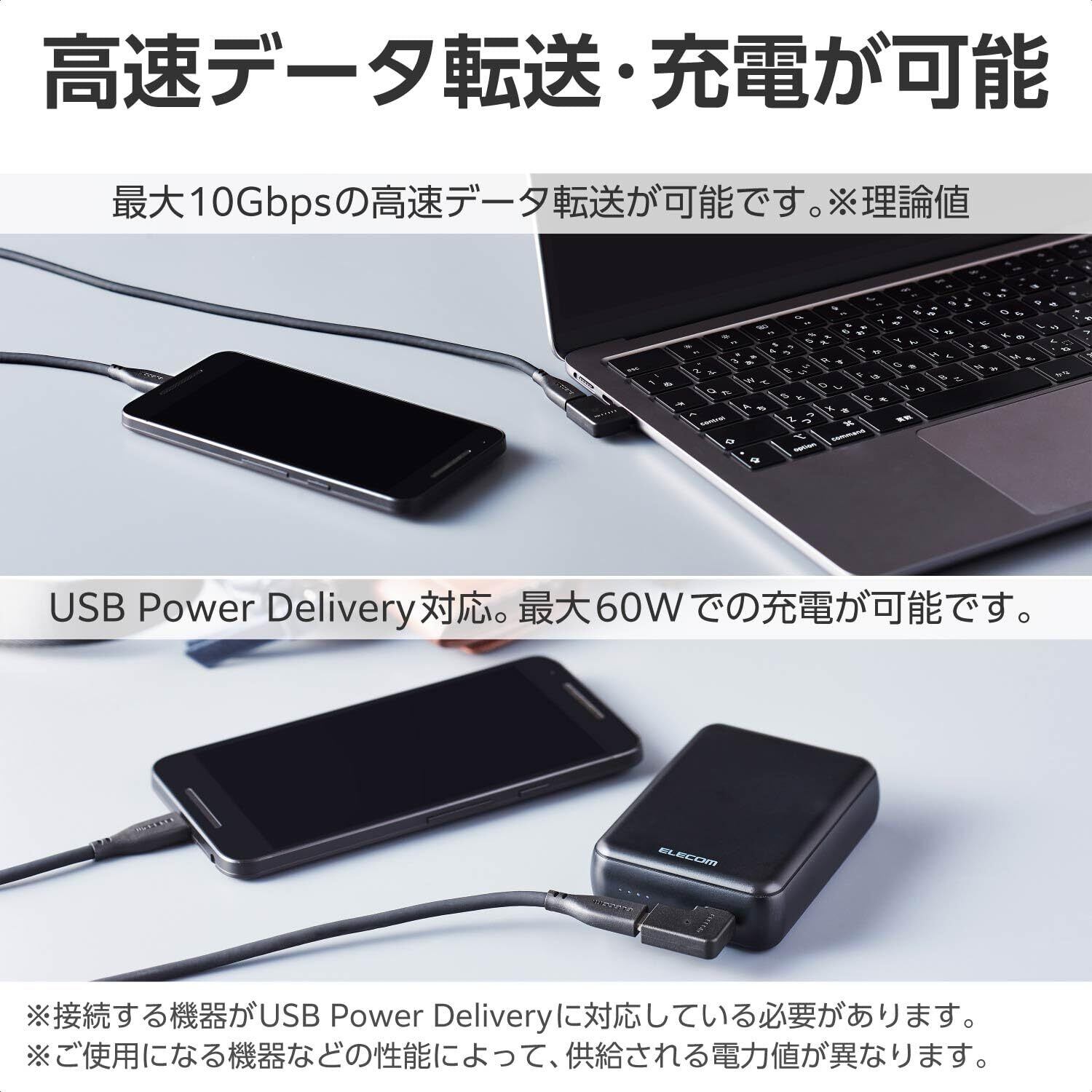 ■USB Power Deliveryに対応し、最大60Wでの充電が可能です。スマートフォンやタブレット、一部のパソコンなどにお使いいただけます。