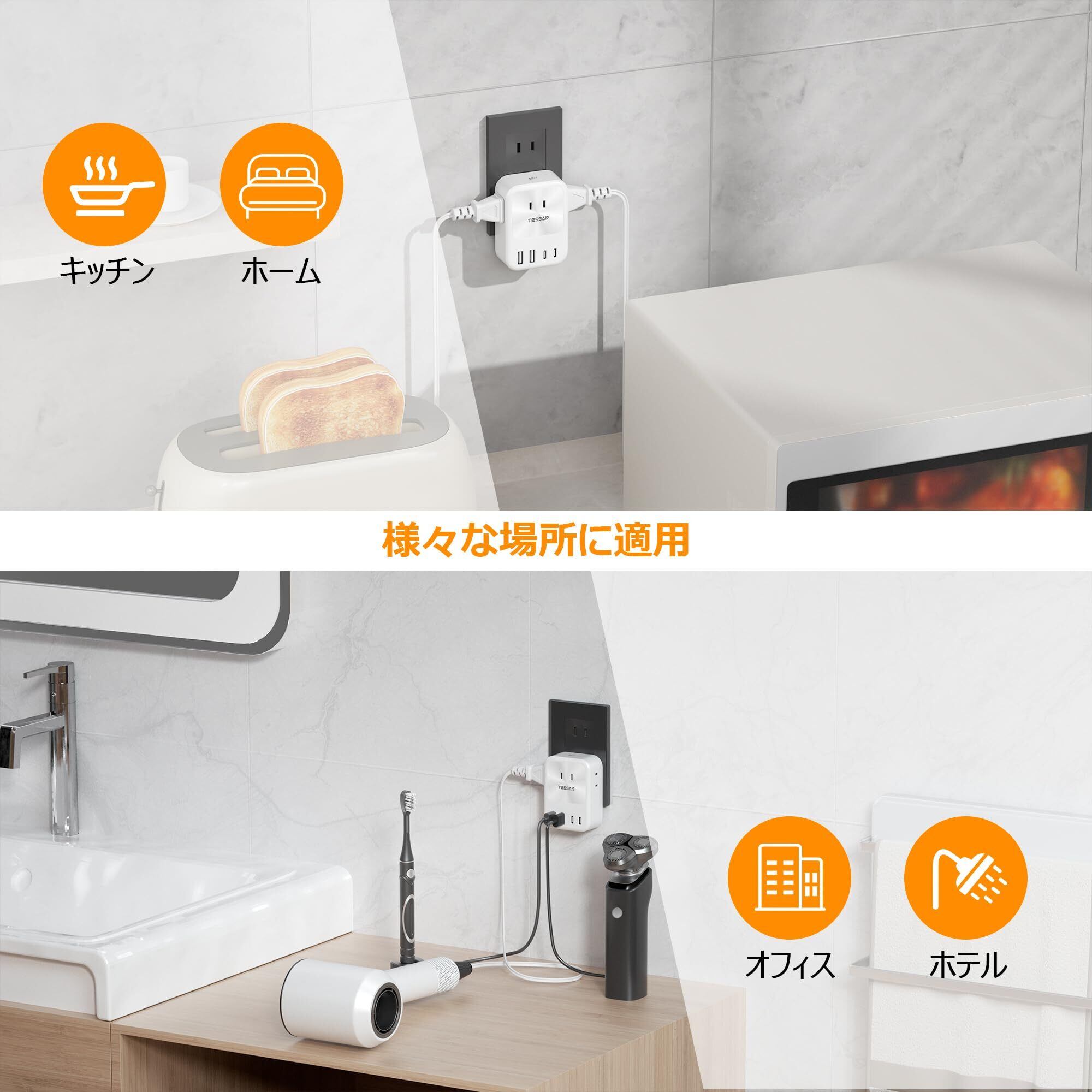 【3AC+2USB-A+2USB-C】従来の伝統的なこんせんと たっぷと違って、type-cポート及びtype-aポートが同時搭載している壁直差しタップです。また、2個のusb-aポート、2個のusb-cポートと3個のac差込口を搭載しているusb コンセントタップです。これ1つのusb アダプタ 電源タップで、7台の電子機器を同時に充電できます。3個のAC口は異なる三つの方向に配置されていて、お互いに干渉しないで、大きなアダプター同士が同時に挿入しても大丈夫です。