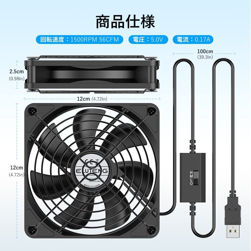 ELUTENG USBファン 12cm 冷却ファン 強力 1500RPM USB扇風機 5V 静音 長持ち玉軸受 3段階調節 薄型 7枚羽根 長寿命 卓上 PC ゲーム機 ルーターなど対応 USB fan 12cm
